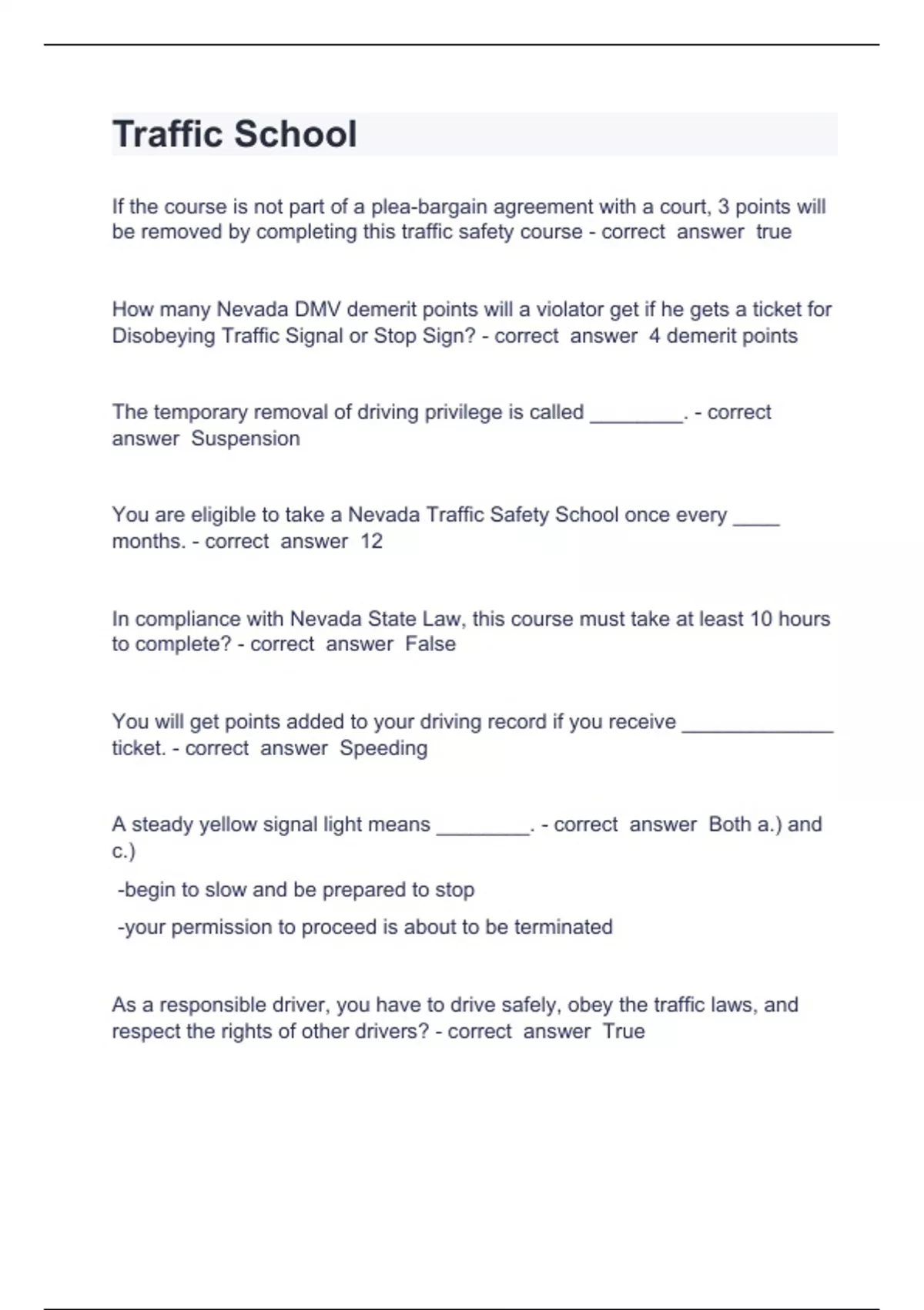 Traffic School Question and answers correctly solved 2024 If the course is not part of a plea-bargain agreement with a court, 3 points will be removed by completing this traffic safety course - correct answer true How many Nevada DMV demerit points will a violator get if he gets a ticket for Disobeying Traffic Signal or Stop Sign? - correct answer 4 demerit points The temporary removal of driving privilege is called ________. - correct answer Suspension You are eligible to take a Nevada Traffic Safety School once every ____ months. - correct answer 12 In compliance with Nevada State Law, this course must take at least 10 hours to complete? - correct answer False You will get points added to your driving record if you receive _____________ ticket. - correct answer Speeding A steady yellow signal light means ________. - correct answer Both a.) and c.) -begin to slow and be prepared to stop -your permissi