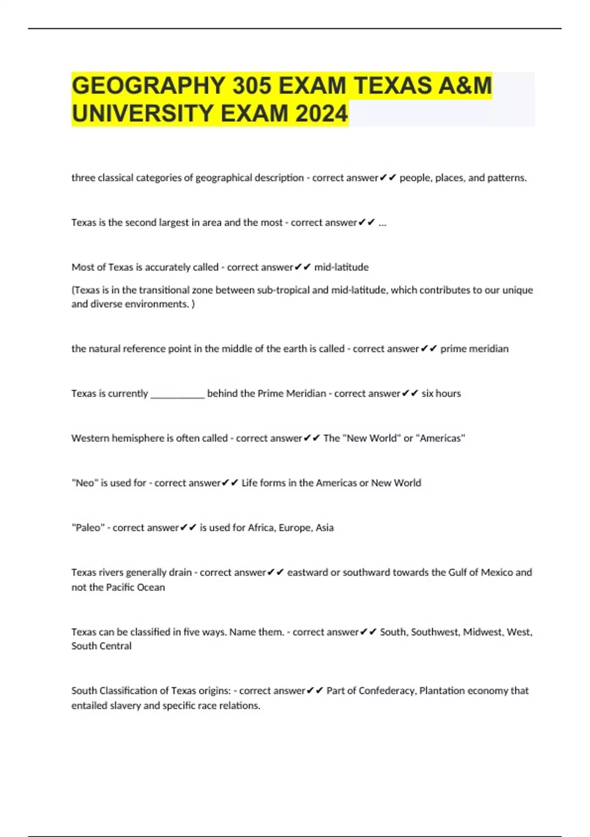 GEOGRAPHY 305 EXAM TEXAS A&M UNIVERSITY EXAM 2024