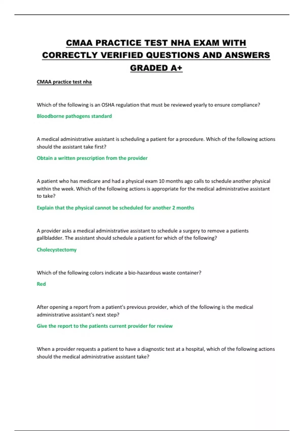 CMAA PRACTICE TEST NHA EXAM WITH CORRECTLY VERIFIED QUESTIONS AND ANSWERS GRADED A+
