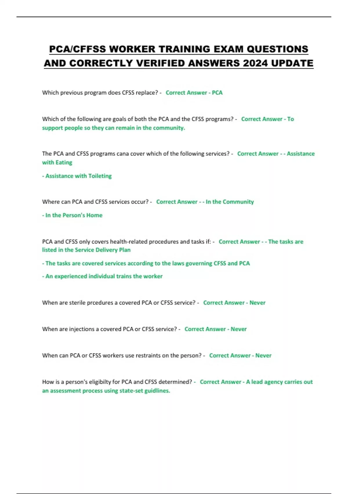 PCA/CFFSS WORKER TRAINING EXAM QUESTIONS AND CORRECTLY VERIFIED ANSWERS 2024 UPDATE