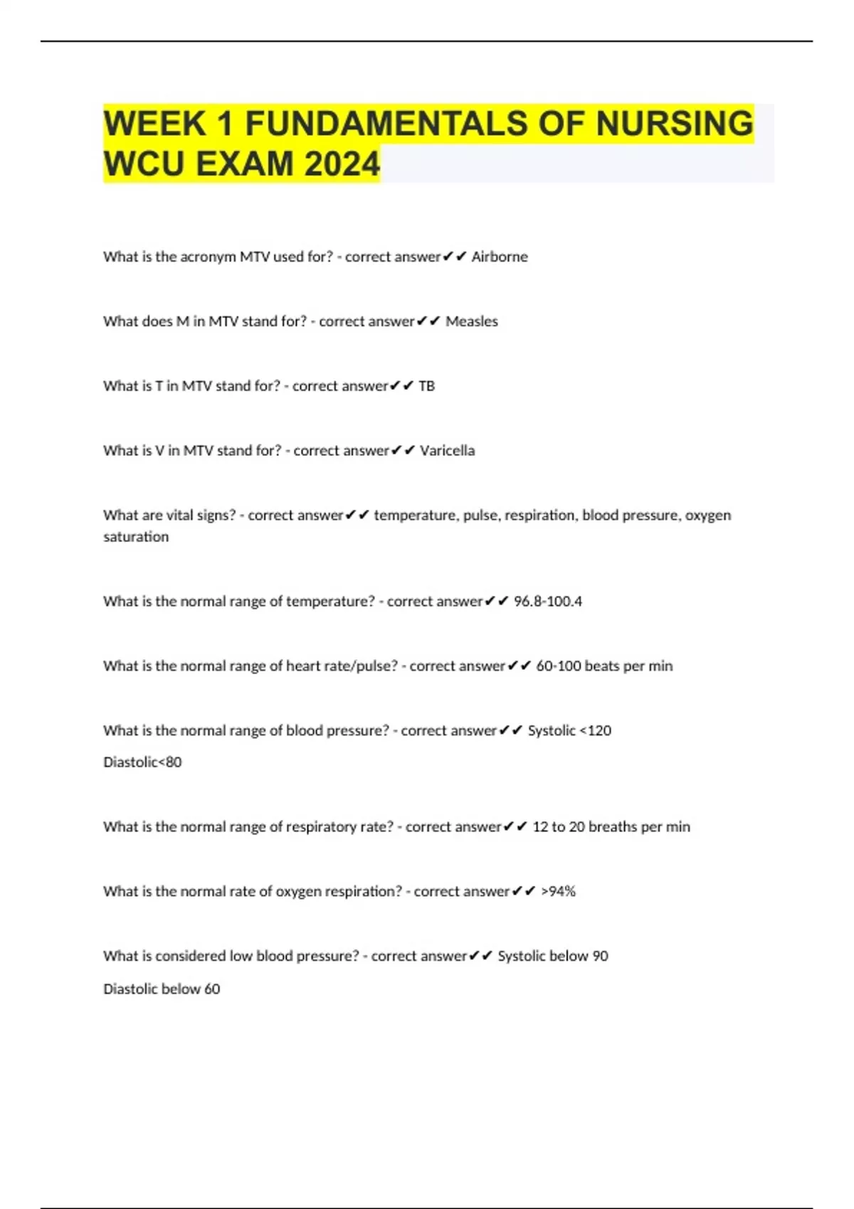 What is the acronym MTV used for? - correct answer Airborne What does M in MTV stand for? - correct answer Measles What is T in MTV stand for? - correct answer TB What is V in MTV stand for? - correct answer Varicella What are vital signs? - correct answer temperature, pulse, respiration, blood pressure, oxygen saturation What is the normal range of temperature? - correct answer 96.8-100.4 What is the normal range of heart rate/pulse? - correct answer 60-100 beats per min What is the normal range of blood pressure? - correct answer Systolic <120 Diastolic<80 What is the normal range of respiratory rate? - correct answer 12 to 20 breaths per min