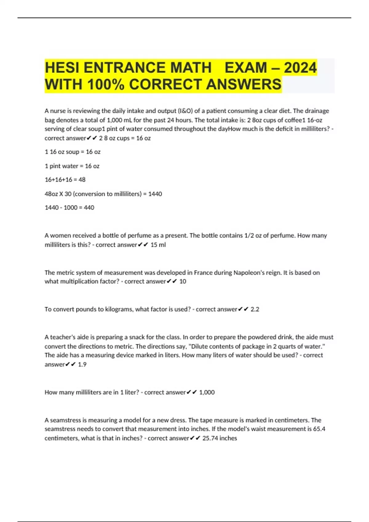 HESI ENTRANCE MATH EXAM – 2024 WITH 100% CORRECT ANSWERS
