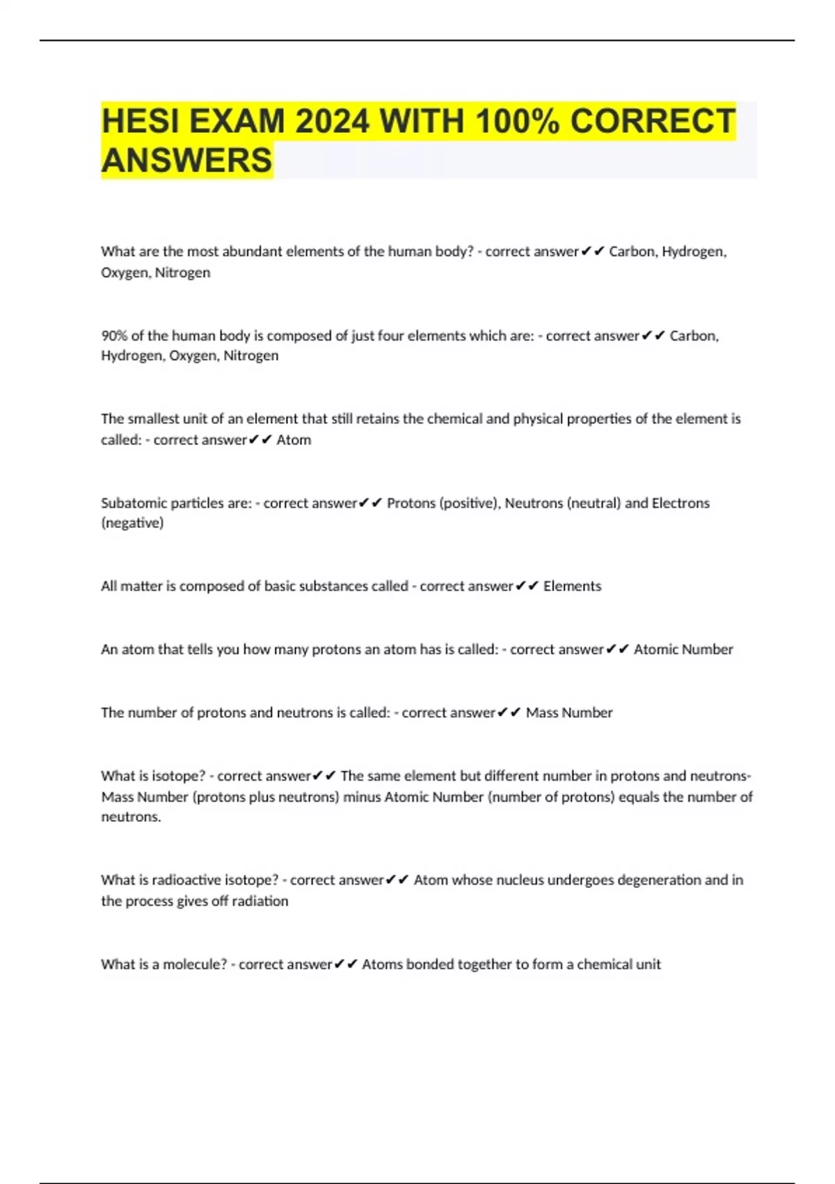 What are the most abundant elements of the human body? - correct answer Carbon, Hydrogen, Oxygen, Nitrogen 90% of the human body is composed of just four elements which are: - correct answer Carbon, Hydrogen, Oxygen, Nitrogen The smallest unit of an element that still retains the chemical and physical properties of the element is called: - correct answer Atom Subatomic particles are: - correct answer Protons (positive), Neutrons (neutral) and Electrons (negative) All matter is composed of basic substances called - correct answer Elements An atom that tells you how many protons an atom has is called: - correct answer Atomic Number The nu