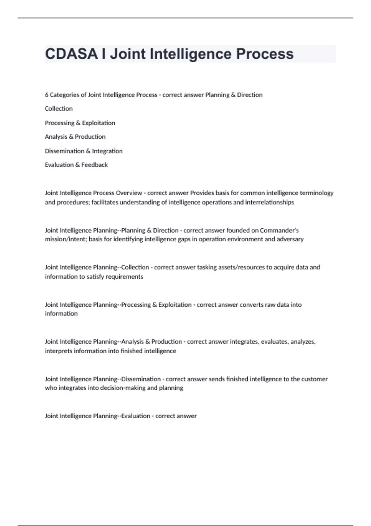 CDASA I Joint Intelligence Process Question and answers rated A+ 2024 6 Categories of Joint Intelligence Process - correct answer Planning & Direction Collection Processing & Exploitation Analysis & Production Dissemination & Integration Evaluation & Feedback Joint Intelligence Process Overview - correct answer Provides basis for common intelligence terminology and procedures; facilitates understanding of intelligence operations and interrelationships Joint Intelligence Planning--Planning & Direction - correct answer founded on Commander's mission/intent; basis for identifying intelligence gaps in operation environment and adversary Joint Intelligence Planning--Collection - correct answer tasking assets/resources to acquire data and information to satisfy requirements Joint Intelligence Planning--Processing & Exploitation - correct answer converts raw data into information Joint Intelligence Planning--Analysis & Production - correct answer integrates, evaluates, analyzes, interprets information into finished intelligence Joint Intelligence Planning--Dissemination - correct answer sends finished intelligence to the customer who integrates into decision-making and planning Joint Intelligence Planning--Evalu