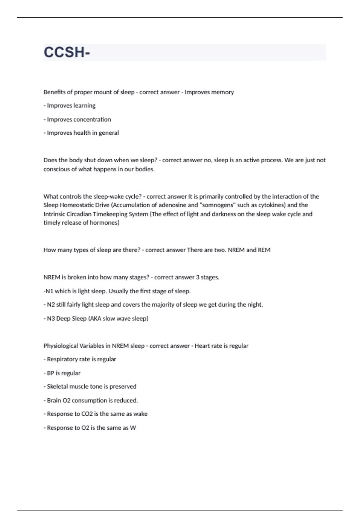 CCSH Questions with complete solution 2024 Benefits of proper mount of sleep - correct answer - Improves memory - Improves learning - Improves concentration - Improves health in general Does the body shut down when we sleep? - correct answer no, sleep is an active process. We are just not conscious of what happens in our bodies. What controls the sleep-wake cycle? - correct answer It is primarily controlled by the interaction of the Sleep Homeostatic Drive (Accumulation of adenosine and "somnogens" such as cytokines) and the Intrinsic Circadian Timekeeping System (The effect of light and darkness on the sleep wake cycle and timely release of hormones) How many types of sleep are there? - correct answer There are two. NREM and REM NREM is broken into how many stages? - correct answer 3 stages. -N1 which is light sleep. Usually the first stage of sleep. - N2 still fairly light sleep and covers the majority of sleep we get during the night. - N3 Deep Sleep (AKA slow wave sleep) Physiological Variables in NREM sleep - correct answer - Heart rate is regular - Respiratory rate is regular - BP is regular - Skeletal muscle tone is preserved - Brain O2 consumption is reduced. - Response to CO2 is the same as wake - Response to O2 is the same as W