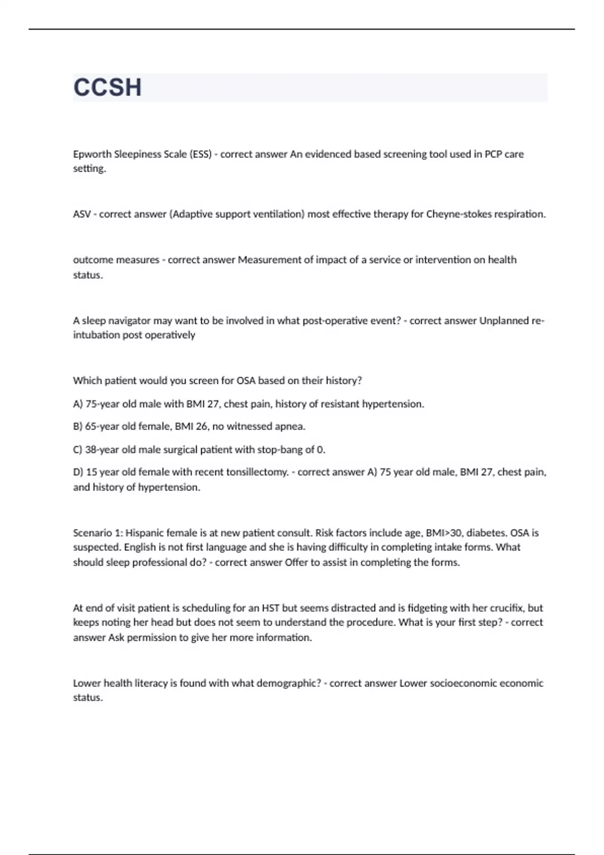 CCSH Question and answers rated A+ 2024 Epworth Sleepiness Scale (ESS) - correct answer An evidenced based screening tool used in PCP care setting. ASV - correct answer (Adaptive support ventilation) most effective therapy for Cheyne-stokes respiration. outcome measures - correct answer Measurement of impact of a service or intervention on health status. A sleep navigator may want to be involved in what post-operative event? - correct answer Unplanned re-intubation post operatively Which patient would you screen for OSA based on their history? A) 75-year old male with BMI 27, chest pain, history of resistant hypertension. B) 65-year old female, BMI 26, no witnessed apnea. C) 38-year old male surgical patient with stop-bang of 0. D) 15 year old female with recent tonsillectomy. - correct answer A) 75 year old male, BMI 27, chest pain, and history of hypertension. Scenario 1: Hispanic female is at new patient consult. Risk factors include age, BMI>30, diabetes. OSA is suspected. English is not first language and she is having difficulty in completing intake forms. What should sleep professional do? - correct answer Offer to assist in completing the forms. At end of visit patient is scheduling for an HST but seems distracted and is fidgeting with her crucifix, but keeps noting her head but does not seem to understand the procedure. What is your first step? - correct answer Ask permission to give her more information. Lower health liter