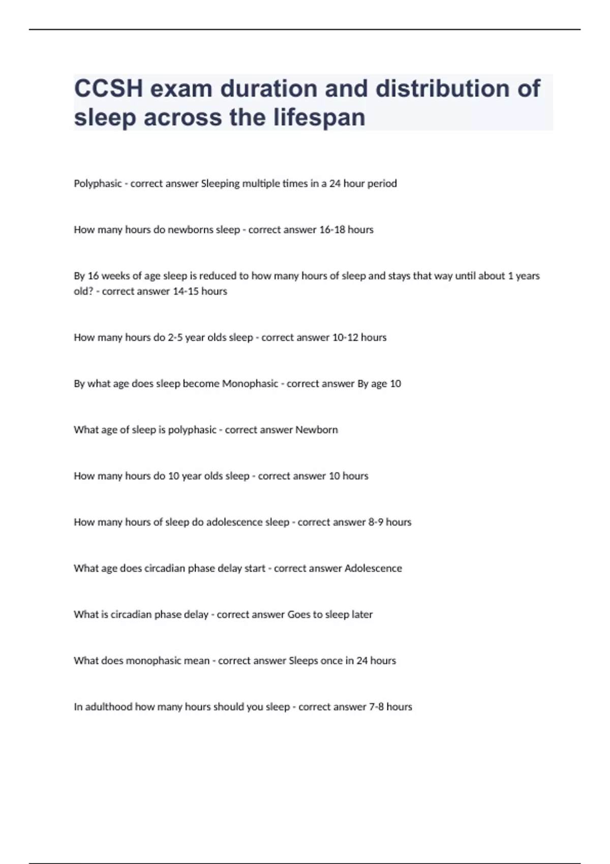 CCSH exam duration and distribution of sleep across the lifespan Question and answers 2024 verified to passPolyphasic - correct answer Sleeping multiple times in a 24 hour period How many hours do newborns sleep - correct answer 16-18 hours By 16 weeks of age sleep is reduced to how many hours of sleep and stays that way until about 1 years old? - correct answer 14-15 hours How many hours do 2-5 year olds sleep - correct answer 10-12 hours By what age does sleep become Monophasic - correct answer By age 10 What age of sleep is polyphasic - correct answer Newborn How many hours do 10 year olds sleep - correct answer 10 hours How many hours of sleep do adolescence sleep - correct answer 8-9 hours What age does circadian phase delay start - correct answer Adolescence What is circadian phase delay - correct answer Goes to sleep later What does monophasic me