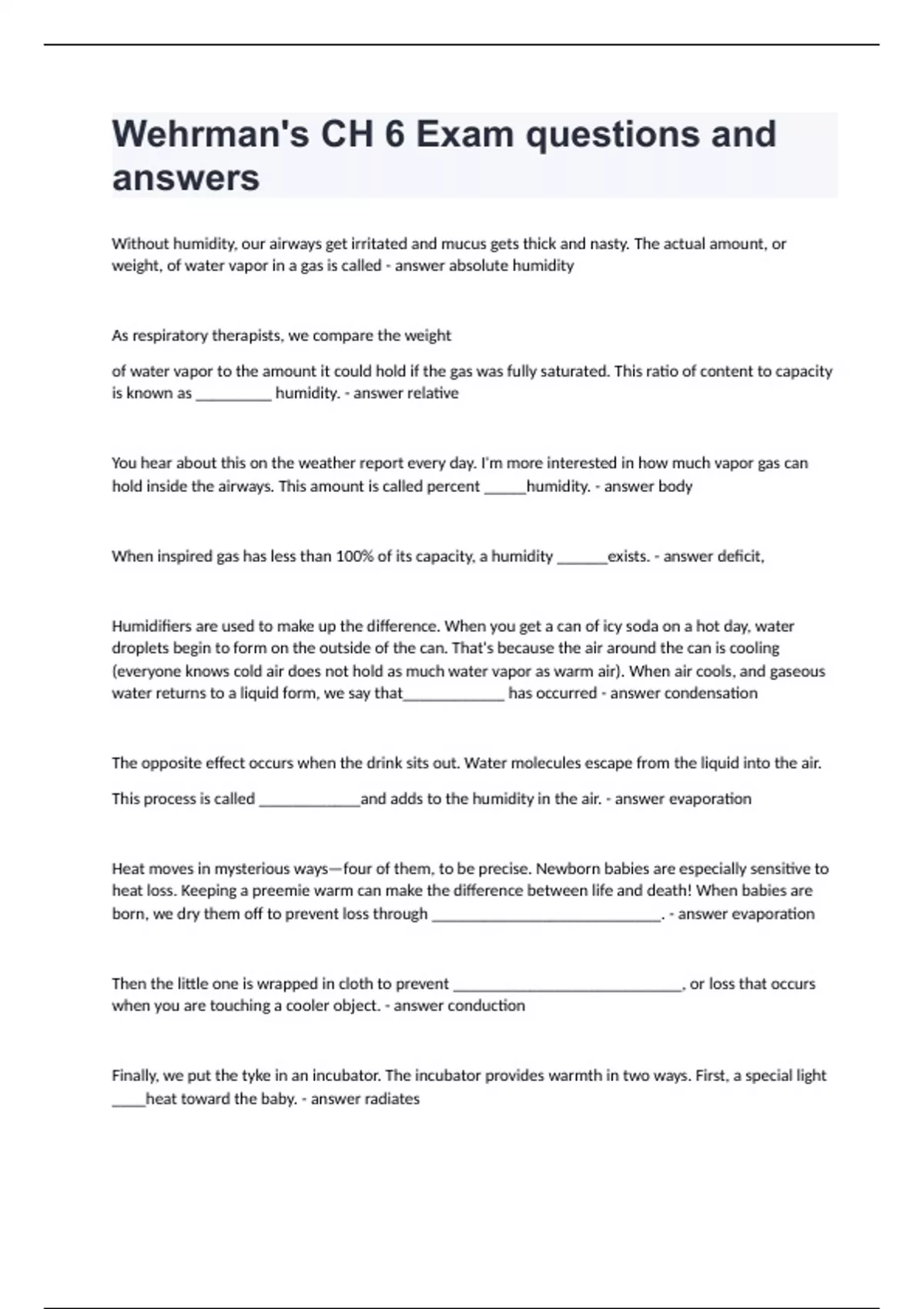 Without humidity, our airways get irritated and mucus gets thick and nasty. The actual amount, or weight, of water vapor in a gas is called absolute humidity As respiratory therapists, we compare the weight of water vapor to the amount it could hold if the gas was fully saturated. This ratio of content to capacity is known as _________ humidity. relative You hear about this on the weather report every day. I'm more interested in how much vapor gas can hold inside the airways. This amount is called percent _____humidity. body When inspired gas has less than 100% of its capacity, a humidity ______exists. deficit, Humidifiers are used to make up the difference. When you get a can of icy soda on a hot day, water droplets begin to form on the outside of the can. That's because the air around the can is cooling (everyone knows cold air does not hold as much water vapor as warm air). When air cools, and gaseous water returns to a liquid form, we say that____________ has occurred condensation The opposite effect occurs when the drink sits out. Water molecules escape from the liquid into the air. This process is called ____________and adds to the humidity in the air. evaporation Heat moves in mysterious ways—four of them, to be precise. Newborn babies are especially sensitive to heat loss. Keeping a preemie warm can make the difference between life and death! When babies are born, we dry them off to prevent loss through ___________________________. evaporation Then the little one is wrapped in cloth to prevent ___________________________, or loss that occurs when you are touching a cooler object. conduction Finally, we put the tyke in an incubator. The incubator provides warmth in two ways. First, a special light ____heat toward the baby. radiates Second, warm air blows into the incubator. Transfer of heat through movement of fluids (or gas) is called ___________________________. convection A registered pulmonary function technologist (RPFT) is performing lung testing on a patient. The patient inhales 1.5 L from the spirometer 1. What will happen to the volume of gas inside the patient's lungs? 2. What is the gas law? 1. The volume of gas will expand. 2. Charles' law A home care respiratory therapist places an oxygen cylinder in the van so that she can take it to a client's house. The sun is shining through the window on the cylinder. 3. What will happen to the pressure inside the cylinder as it gets warmer? 4. What is the gas law? 3. Pressure will increase in the cylinder. 4. Guy-Lussac law When you start to inhale, your diaphragm drops and your chest expands. In other words, you increase the size, or volume, of your chest. 5. What happens to the pressure inside your chest? 6. What is the gas law? 5. Decreases 6. Boyle's law Place a dry, empty glass soda bottle in the freezer for at least 15 minutes. Take the bottle out and immediately cover the mouth of the bottle with a balloon. Wait a few minutes and watch! 7. What happened to the balloon? 8. What gas law is responsible for the result? 7. The balloon inflates or expands. 8. Charles' law