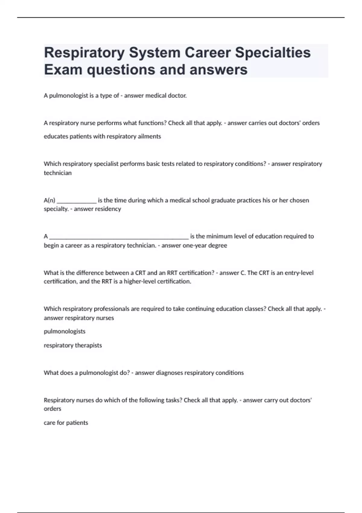 A pulmonologist is a type of medical doctor. A respiratory nurse performs what functions? Check all that apply. carries out doctors' orders educates patients with respiratory ailments Which respiratory specialist performs basic tests related to respiratory conditions? respiratory technician A(n) ____________ is the time during which a medical school graduate practices his or her chosen specialty. residency A __________________________________________ is the minimum level of education required to begin a career as a respiratory technician. one-year degree What is the difference between a CRT and an RRT certification? C. The CRT is an entry-level certification, and the RRT is a higher-level certification. Which respiratory professionals are required to take continuing education classes? Check all that apply. respiratory nurses pulmonologists respiratory therapists What does a pulmonologist do? diagnoses respiratory conditions Respiratory nurses do which of the following tasks? Check all that apply. carry out doctors' orders care for patients work in hospitals educate patients Respiratory therapists evaluate patients to understand the severity of their respiratory condition. Respiratory technicians are trained to perform tests. What is the minimum level of education required to become a respiratory technician? one-year degree What is the minimum level of education required to become a respiratory therapist? two-year degree A college student has decided to become a doctor and specialize in pulmonology. What is her next step, after completing an undergraduate degree? medical school A _____________________________ is required to become a licensed practical nurse. one-year degree A _____________________ is required to become a registered nurse. two-year degree How do LPNs and RNs become respiratory care LPNs and RNs? They acquire specialized training. All of the respiratory specialties require hands-on training What do many employers require of respiratory technicians? Check all that apply. basic life support certification certification from the National Board for Respiratory Care Which of the following is required of a pulmonologist? Check all that apply. continuing education courses attending workshops and conferences medical school degree A nurse has just passed the National Council Licensure Examination. Therefore, the nurse is now licensed. The National Board for Respiratory Care administers exams that certify nurses to be respiratory care nurses. What are the requirements for a certified respiratory therapist? Check all that apply. license two-year degree certification Registered respiratory therapists are preferred over CRTs in hospitals because the have more proven skill and knowledge. If a respiratory therapist has an RRT certification, what does that mean? The respiratory therapist must first have had a CRT certification. Pediatric pulmonary medicine has to do with children's respiratory conditions. Programs for respiratory nurses and respiratory therapists include classroom learning as well as hands-on experience.