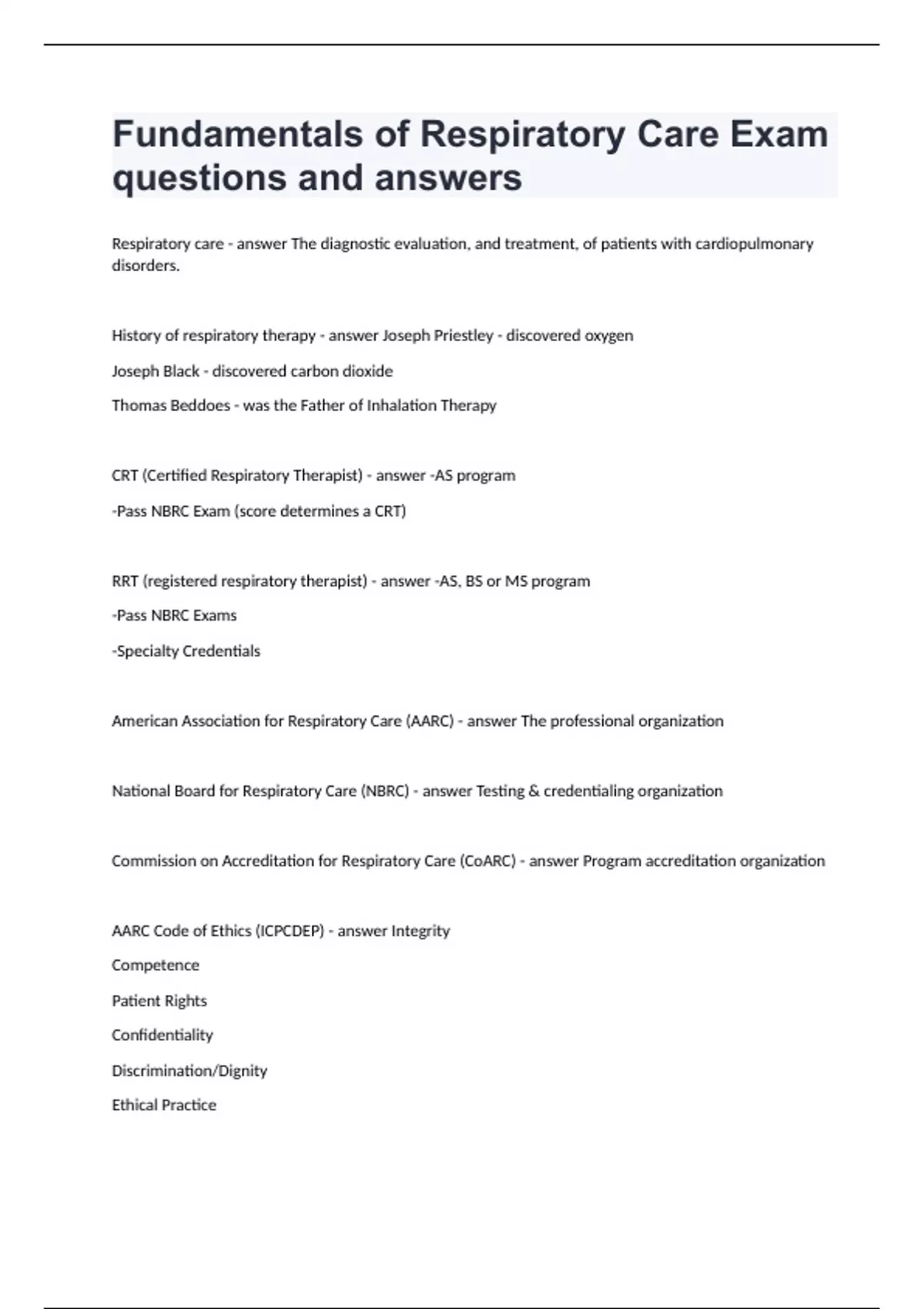 Respiratory care The diagnostic evaluation, and treatment, of patients with cardiopulmonary disorders. History of respiratory therapy Joseph Priestley - discovered oxygen Joseph Black - discovered carbon dioxide Thomas Beddoes - was the Father of Inhalation Therapy CRT (Certified Respiratory Therapist) -AS program -Pass NBRC Exam (score determines a CRT) RRT (registered respiratory therapist) -AS, BS or MS program -Pass NBRC Exams -Specialty Credentials American Association for Respiratory Care (AARC) The professional organization National Board for Respiratory Care (NBRC) Testing & credentialing organization Commission on Accreditation for Respiratory Care (CoARC) Program accreditation organization AARC Code of Ethics (ICPCDEP) Integrity Competence Patient Rights Confidentiality Discrimination/Dignity Ethical Practice Promote Profession & Practice Service Areas of Respiratory Care General Therapeutics Critical Care Emergency care Diagnostics Pulmonary Rehabilitation Education Palliative and end of life care Clinical Practice Guidelines (CPGs) identify "standards of care" Therapist-Driven Protocols algorithm-like care plans that are used to appropriate therapy Evidence Based Medicine A review of evidence for effective treatment primarily using randomized controlled studies. Kinetic theory describes a gas as a large number of submicroscopic particles (atoms or molecules), which are in constant rapid motion. • Small molecules • Kinetic activity noted by the Brownian movement • Elastic, molecular collisions • Kinetic activity increases with increased temperature • Molecules are neutral 14 What is the gram atomic weight of nitrogen? 12 What is the gram atomic weight of carbon? add the weight of the molecules in a substance how do you find the gram molecular weight (GMW)? 22.4 What is the molar volume in Liters at STPD? Avogadro's Law Describe Avogadros Law. 1 gram molecular weight of any gas contains 6.02x1023 MOLECULES, 1 mole at STPD, 1 atm, 0degrees celcius, 1 mole of gas occupies 22.4L of volume