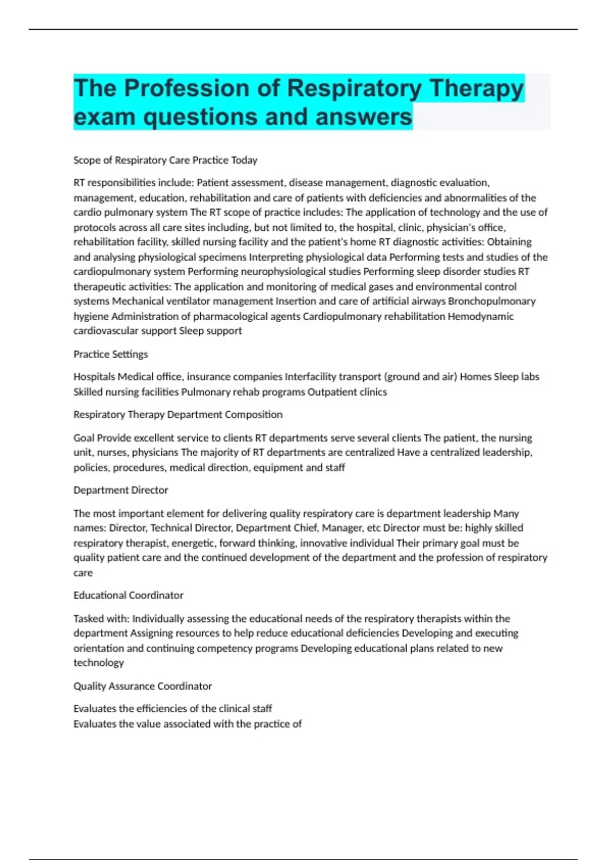 Scope of Respiratory Care Practice Today RT responsibilities include: Patient assessment, disease management, diagnostic evaluation, management, education, rehabilitation and care of patients with deficiencies and abnormalities of the cardio pulmonary system The RT scope of practice includes: The application of technology and the use of protocols across all care sites including, but not limited to, the hospital, clinic, physician's office, rehabilitation facility, skilled nursing facility and the patient's home RT diagnostic activities: Obtaining and analysing physiological specimens Interpreting physiological data Performing tests and studies of the cardiopulmonary system Performing neurophysiological studies Performing sleep disorder studies RT therapeutic activities: The application and monitoring of medical gases and environmental control systems Mechanical ventilator management Insertion and care of artificial airways Bronchopulmonary hygiene Administration of pharmacological agents Cardiopulmonary rehabilitation Hemodynamic cardiovascular support Sleep support Practice Settings Hospitals Medical office, insurance companies Interfacility transport (ground and air) Homes Sleep labs Skilled nursing facilities Pulmonary rehab programs Outpatient clinics Respiratory Therapy Department Composition Goal Provide excellent service to clients RT departments serve several clients The patient, the nursing unit, nurses, physicians The majority of RT departments are centralized Have a centralized leadership, policies, procedures, medical direction, equipment and staff Department Director The most important element for delivering quality respiratory care is department leadership Many names: Director, Technical Director, Department Chief, Manager, etc Director must be: highly skilled respiratory therapist, energetic, forward thinking, innovative individual Their primary goal must be quality patient care and the continued development of the department and the profession of respiratory care Educational Coordinator Tasked with: Individually assessing the educational needs of the respiratory therapists within the department Assigning resources to help reduce educational deficiencies Developing and executing orientation and continuing competency programs Developing educational plans related to new technology Quality Assurance Coordinator Evaluates the efficiencies of the clinical staff Evaluates the value associated with the practice of respiratory care Traditionally efficiencies were determined by the number of procedures (measured by relative value unit / time standard) divided by the effort Full-time equiveillances (FTE) To measure value you must take into consideration things like risk benefit ratio or define benefit Value based efficiency Determined by the amount of benefit provided by the therapy offered divided by the effort in FTE Benefit can be determined in cost savings, survival or perceived benefit from the patient Most value-based models use cost as the objective measure Cost efficient care is often viewed as higher quality care Role identifies opportunities to improve the care provided Supervisors/Lead Therapists Roles that are defined by their names Often more experienced, higher credentialed and hold a higher level of education Oversee and ensure the day to day functionality of the department by: Assigning clinical staff to appropriate workloads and areas in which the department provides services Clinical resource to assist with advanced procedures Leader for managerial issues Respiratory Therapists The heart of the department Front line bedside staff All other roles within the respiratory therapy departments are supportive to RTs Often work 12-hour shifts In larger departments they are often allowed to specialize and work in a specific area of the hospital (ie: ICU, PICU,NICU, CTICU and Burn Units to name a few units)Copyright © 2021 Elsevier, Inc. All Rights Reserved. Medical Director Professionally responsible along with the Department Director for the quality of clinical care that is delivered Responsible for assisting and advising the Department Director on the management of the Respiratory Therapy Department Usually provided by a pulmonary/critical care physician or an Anaesthesiologist Must be available on a 24-hour basis Develop protocols based on he most current research Designations and Credentials of Respiratory Therapists Two levels of general practice credentialing in respiratory care: Certified respiratory therapists (CRTs) Registered respiratory therapists (RRTs)Copyright © 2021 Elsevier, Inc. All Rights Reserved. After completion of an accredited respiratory care educational program May become credentialed by taking the TMC exam The exam has one minimum passing score (cut scores) for There is a higher cut score that allows the candidate to be eligible to take the CSE and become a Researcher Role is growing Departments are employing scientists to help research new and old practices and technology in an effort to continuously improve the care the department provides Expert clinicians and have advanced degrees in science Professional RC Organizations Today Profession A calling that requires specialized knowledge and often long and intensive academic preparation Characterized as an individual conforming to the technical and ethical standards of a profession C