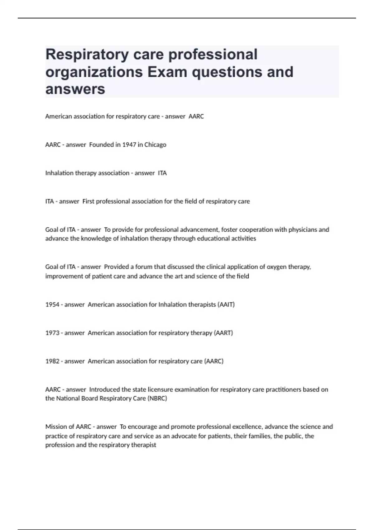 American association for respiratory care AARC AARC Founded in 1947 in Chicago Inhalation therapy association ITA ITA First professional association for the field of respiratory care Goal of ITA To provide for professional advancement, foster cooperation with physicians and advance the knowledge of inhalation therapy through educational activities Goal of ITA Provided a forum that discussed the clinical application of oxygen therapy, improvement of patient care and advance the art and science of the field 1954 American association for Inhalation therapists (AAIT) 1973 American association for respiratory therapy (AART) 1982 American association for respiratory care (AARC) AARC Introduced the state licensure examination for respiratory care practitioners based on the National Board Respiratory Care (NBRC) Mission of AARC To encourage and promote professional excellence, advance the science and practice of respiratory care and service as an advocate for patients, their families, the public, the profession and the respiratory therapist Mission of AARC Sponsors educational activities, international meetings, conferences and seminars Mission of AARC Publishes th science journal Respiratory care Science journal Mission of AARC Advocate for the profession to legislative and regulatory bodies Insurance industry and general public Profession to legislative and regulatory bodies National board for respiratory care NBRC NBRC Credentialling body for respiratory therapists NBRC Began as the American Registry of inhalation therapists in 1960 American registry of inhalation therapists in 1960 To test and credential registered therapists American registry of inhalation therapists in 1960 Certification board was established to certify technicians National board for respiratory therapy Became the national board for respiratory care (NBRC) in 1983 NBRC Collaboration with the national board for cardiopulmonary technologists 1968 2 levels of general clinical practice credetialling examinations in the US was established Certified technicians and registered therapist 2 levels of general clinical practice 1998 Renamed the lower level, CRT (entry level respiratory therapist)