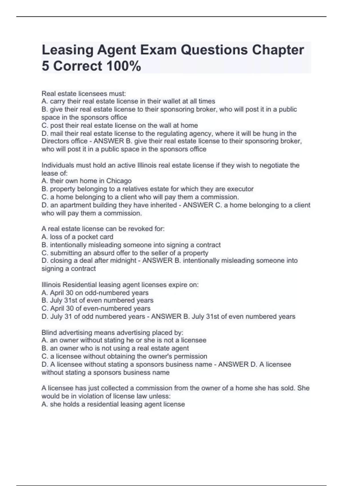 Illinois Real Estate Leasing Agent Exam Correct 100%EXAM BUNDLE