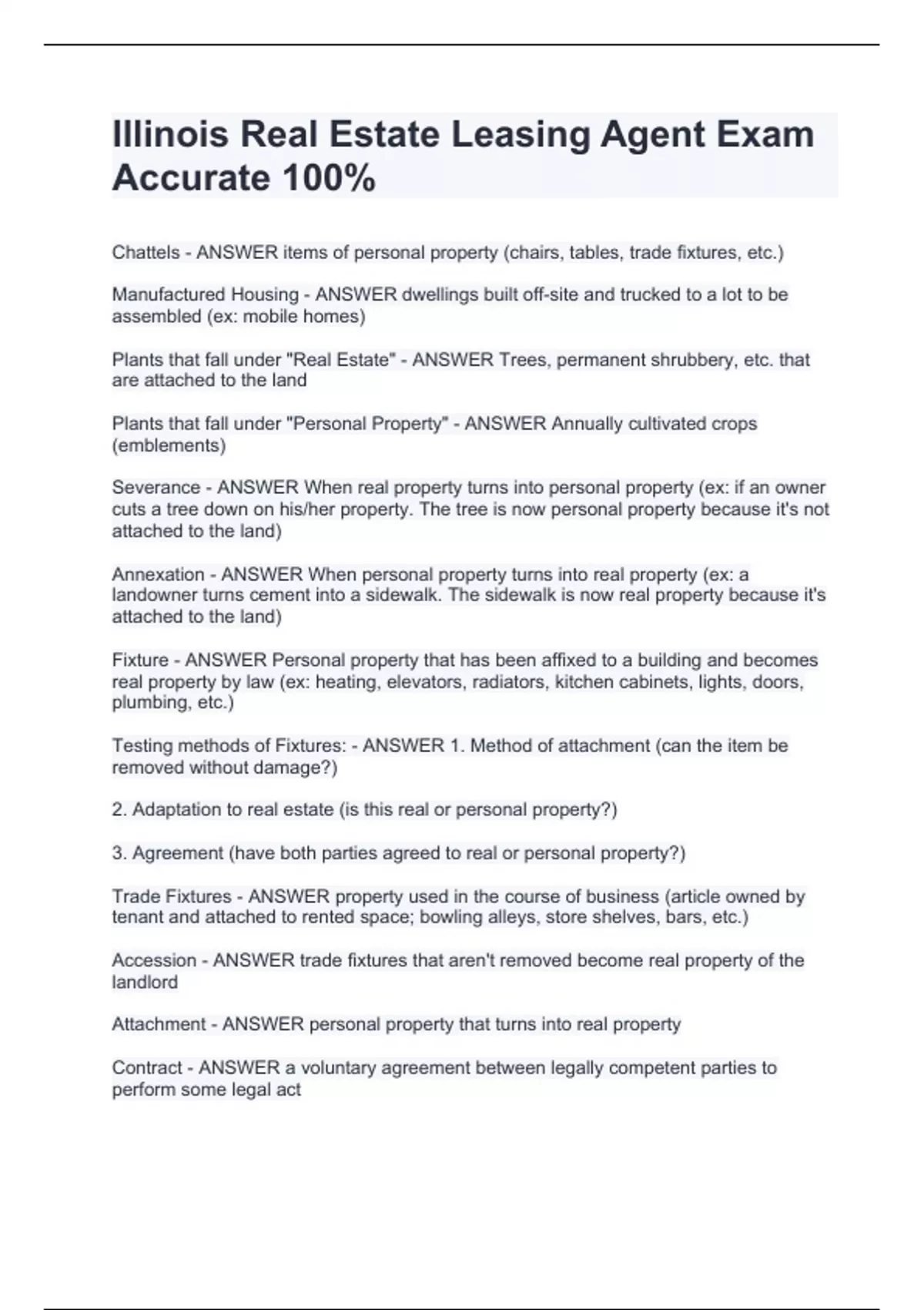 Illinois Real Estate Leasing Agent Exam Correct 100%EXAM BUNDLE