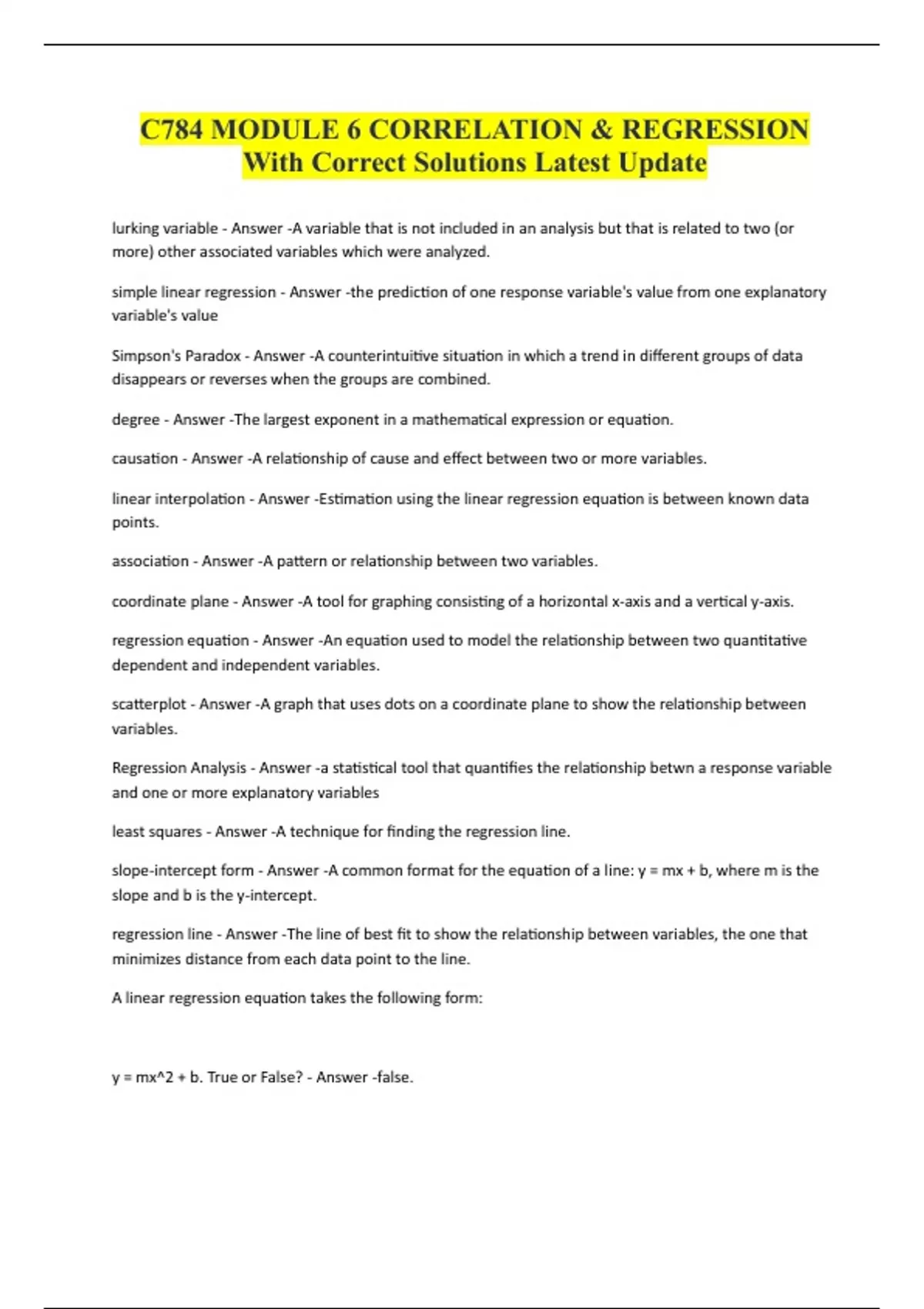 C784 MODULE 6 CORRELATION & REGRESSION With Correct Solutions Latest Update lurking variable - Answer -A variable that is not included in an analysis but that is related to two (or more) other associated variables which were analyzed. simple linear regression - Answer -the prediction of one response variable's value from one explanatory variable's value Simpson's Paradox - Answer -A counterintuitive situation in which a trend in different groups of data disappears or reverses when the groups are combined. degree - Answer -The largest exponent in a mathematical expression or equation. causation - Answer -A relationship of cause and effect between two or more variables. linear interpolation - Answer -Estimation using the linear regression equation is between known data points. association - Answer -A pattern or relationship between two variables. coordinate plane - Answer -A tool for graphing consisting of a horizontal x-axis and a vertical y-axis. regression equation - Answer -An equation used to model the relationship between two quantitative dependent and independent variables. scatterplot - Answer -A graph that uses dots on a coordinate plane to show the relationship between variables. Regression Analysis - Answer -a statistical tool that quantifies the relationship betwn a response variable and one or more explanatory variables least squares - Answer -A technique for finding the regression line. slope-intercept form - Answer -A common format for the equation of a line: y = mx + b, where m is the slope and b is the y-intercept. regression line - Answer -The line of best fit to show the relationship between variables, the one that minimizes distance from each data point to the line. A linear regression equation takes the following form: y