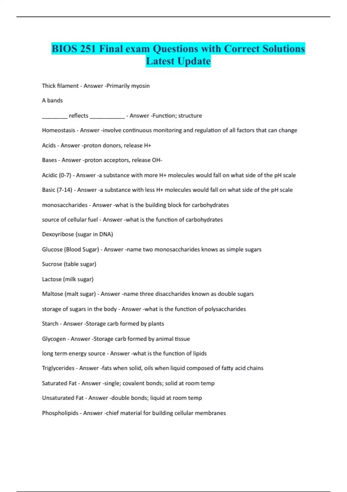 BIOS 251 Final exam Questions with Correct Solutions Latest Update Thick filament - Answer -Primarily myosin A bands ________ reflects ___________ - Answer -Function; structure Homeostasis - Answer -involve continuous monitoring and regulation of all factors that can change Acids - Answer -proton donors, release H+ Bases - Answer -proton acceptors, release OHAcidic (0-7) - Answer -a substance with more H+ molecules would fall on what side of the pH scale Basic (7-14) - Answer -a substance with less H+ molecules would fall on what side of the pH scale monosaccharides - Answer -what is the building block for carbohydrates source of cellular fuel - Answer -what is the function of carbohydrates Dexoyribose (sugar in DNA) Glucose (Blood Sugar) - Answer -name two monosaccharides knows as simple sugars Sucrose (table sugar) Lactose (milk sugar) Maltose (malt sugar) - Answer -name three disaccharides known as double sugars storage of sugars in the body - Answer -what is the function of polysaccharides Starch - Answer -Storage carb formed by plants Glycogen - Answer -Storage carb formed by animal tissue long term energy source - Answer -what is the function of lipids Triglycerides - Answer -fats when solid, oils when liquid composed of fatty acid chains Saturated Fat - Answer -single; covalent bonds; solid at room temp Unsaturated Fat - Answer -double bonds; liquid at room temp Phospholipids - Answer -chief material for building cellular membranes