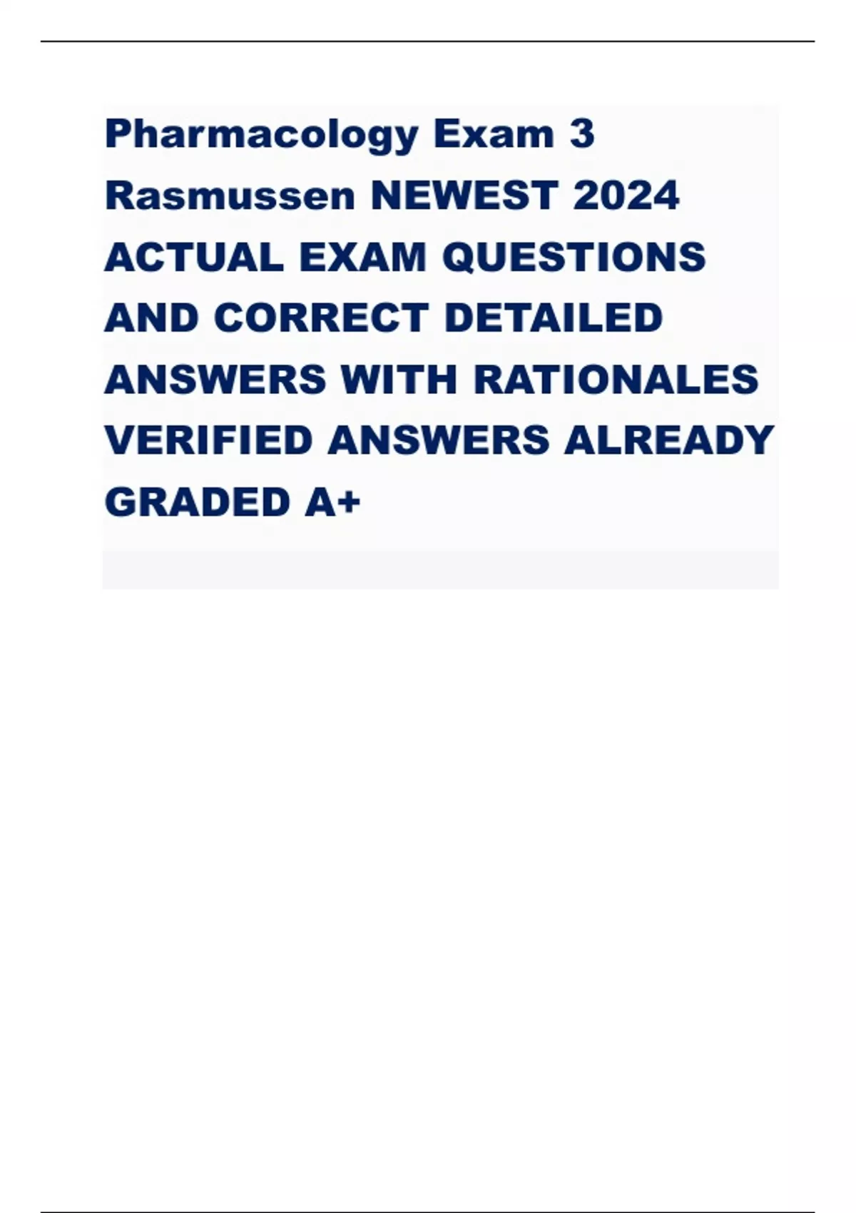 The document is a meticulously curated resource containing the latest Pharmacology Exam 3 questions from Rasmussen University as of 2024. Each question is accompanied by its corresponding detailed answer, which has been thoroughly verified and graded A. The answers include comprehensive explanations and rationales, providing students with a deep understanding of the concepts tested. The content covers a wide range of pharmacological topics, including drug classifications, pharmacokinetics, pharmacodynamics, adverse effects, therapeutic indications, and nursing implications. This document serves as an invaluable study aid for students preparing for their Pharmacology Exam 3, offering reliable and accurate information to help them succeed.