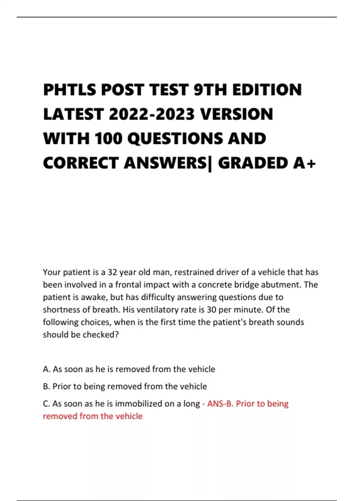 The document is a post-test designed to assess knowledge and comprehension of the Prehospital Trauma Life Support (PHTLS) protocols and guidelines as outlined in the 9th edition, with the latest updates from 2022. It consists of questions covering various aspects of prehospital trauma care, including assessment, treatment, and management of trauma patients. The test aims to evaluate the understanding of PHTLS principles, trauma assessment techniques, airway management, hemorrhage control, spinal immobilization, patient packaging, and transportation considerations. Each question is crafted to challenge the test-taker's understanding of PHTLS concepts and their application in real-world scenarios. Additionally, the document may include detailed explanations and rationales for each question to aid in understanding and reinforce learning. Overall, the post-test serves as a valuable tool for assessing competency and readiness in providing effective prehospital trauma care according to the latest PHTLS guidelines.