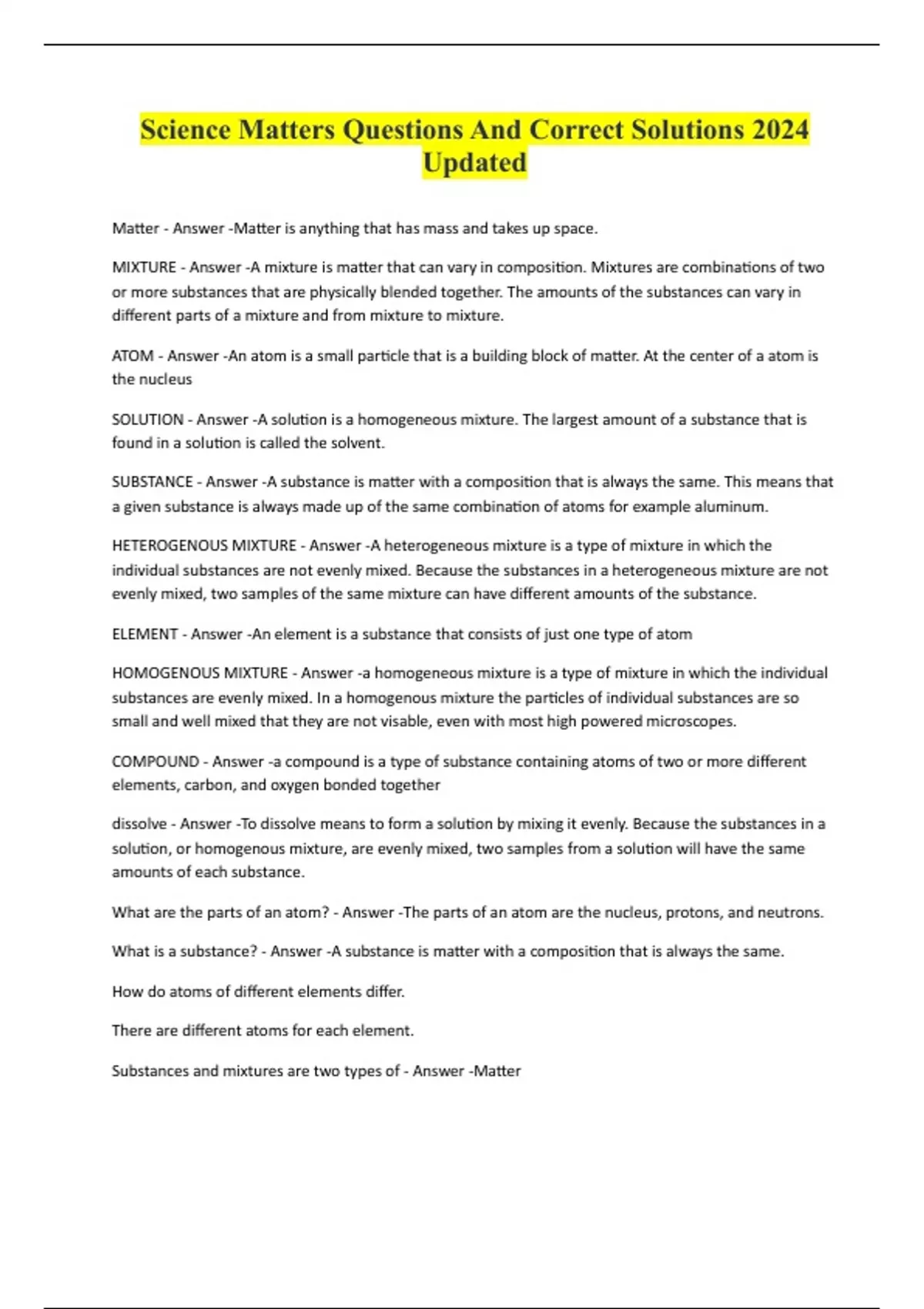 Science Matters Questions And Correct Solutions 2024 Updated Matter - Answer -Matter is anything that has mass and takes up space. MIXTURE - Answer -A mixture is matter that can vary in composition. Mixtures are combinations of two or more substances that are physically blended together. The amounts of the substances can vary in different parts of a mixture and from mixture to mixture. ATOM - Answer -An atom is a small particle that is a building block of matter. At the center of a atom is the nucleus SOLUTION - Answer -A solution is a homogeneous mixture. The largest amount of a substance that is found in a solution is called the solvent. SUBSTANCE - Answer -A substance is matter with a composition that is always the same. This means that a given substance is always made up of the same combination of atoms for example aluminum. HETEROGENOUS MIXTURE - Answer -A heterogeneous mixture is a type of mixture in which the individual substances are not evenly mixed. Because the substances in a heterogeneous mixture are not evenly mixed, two samples of the same mixture can have different amounts of the substance. ELEMENT - Answer -An element is a substance that consists of just one type of atom HOMOGENOUS MIXTURE - Answer -a homogeneous mixture is a type of mixture in which the individual substances are evenly mixed. In a homogenous mixture the particles of individual substances are so small and well mixed that they are not visable, even with most high powered microscopes. COMPOUND - Answer -a compound is a type of substance containing atoms of two or more different elements, carbon, and oxygen bonded together dissolve - Answer -To dissolve means to form a solution by mixing it evenly. Because the substances in a solution, or homogenous mixture, are evenly mixed, two samples from a solution will have the same amounts of each substance. What are the parts of an atom? - Answer -The parts of an atom are the nucleus, protons, and neutrons. What is a substance? - Answer -A substance is matter with a composition that is always the same. How do atoms of different elements differ. There are different atoms for each element. Substances and mixtures are two types of - Answer -Matter