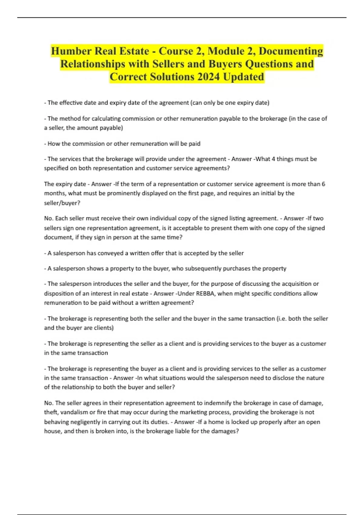Humber Real Estate - Course 2, Module 2, Documenting Relationships with Sellers and Buyers Questions and Correct Solutions 2024 Updated