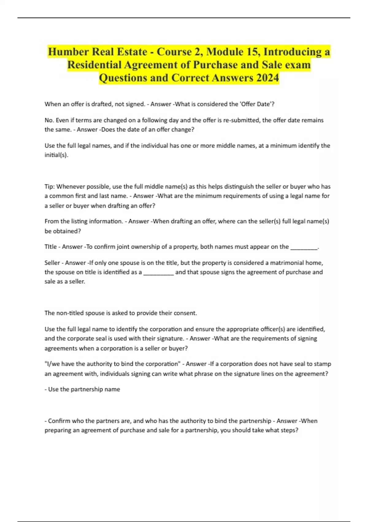 Humber Real Estate - Course 2, Module 15, Introducing a Residential Agreement of Purchase and Sale exam Questions and Correct Answers 2024 When an offer is drafted, not signed. - Answer -What is considered the 'Offer Date'? No. Even if terms are changed on a following day and the offer is re-submitted, the offer date remains the same. - Answer -Does the date of an offer change? Use the full legal names, and if the individual has one or more middle names, at a minimum identify the initial(s). Tip: Whenever possible, use the full middle name(s) as this helps distinguish the seller or buyer who has a common first and last name. - Answer -What are the minimum requirements of using a legal name for a seller or buyer when drafting an offer? From the listing information. - Answer -When drafting an offer, where can the seller(s) full legal name(s) be obtained? TItle - Answer -To confirm joint ownership of a property, both names must appear on the ________. Seller - Answer -If only one spouse is on the title, but the property is considered a matrimonial home, the spouse on title is identified as a _________ and that spouse signs the agreement of purchase and sale as a seller. The non-titled spouse is asked to provide their consent. Use the full legal name to identify the corporation and ensure the appropriate officer(s) are identified, and the corporate seal is used with their signature. - Answer -What are the requirements of signing agreements when a corporation is a seller or buyer? "I/we have the authority to bind the corporation" - Answer -If a corporation does not have seal to stamp an agreement with, individuals signing can write what phrase on the signature lines on the agreement? - Use the partnership name - Confirm who the partners are, and who has the authority to bind the partnership - Answer -When preparing an agreement of purchase and sale for a partnership, you should take what steps?- In a general partnership, one partner can sign the agreement which binds the partnership - In a limited partnership, a limited partner may not have this authority - Answer -What's the difference between a general partnership and a limited partnership? An estate trustee - Answer -Who is the only person with legal auth