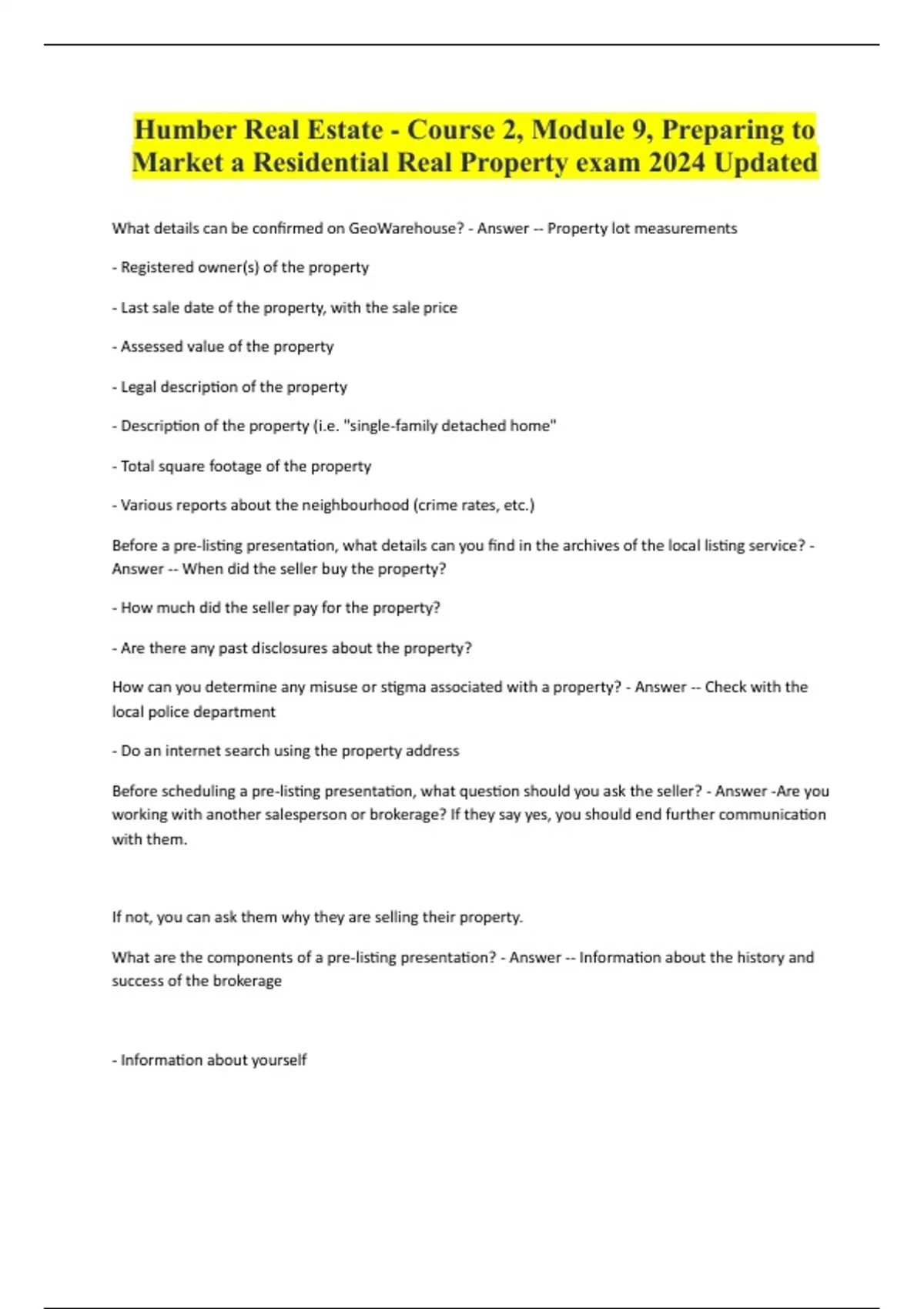 Humber Real Estate - Course 2, Module 9, Preparing to Market a Residential Real Property exam 2024 Updated What details can be confirmed on GeoWarehouse? - Answer -- Property lot measurements - Registered owner(s) of the property - Last sale date of the property, with the sale price - Assessed value of the property - Legal description of the property - Description of the property (i.e. "single-family detached home" - Total square footage of the property - Various reports about the neighbourhood (crime rates, etc.) Before a pre-listing presentation, what details can you find in the archives of the local listing service? - Answer -- When did the seller buy the property? - How much did the seller pay for the property? - Are there any past disclosures about the property? How can you determine any misuse or stigma associated with a property? - Answer -- Check with the local police department - Do an internet search using the property address Before scheduling a pre-listing presentation, what question should you ask the seller? - Answer -Are you working with another salesperson or brokerage? If they say yes, you should end further communication with them. If not, you can ask them why they are selling their property. What are the components of a pre-listing presentation? - Answer -- Information about the history and success of the brokerage - Information about yourself- Applicable forms, such as a representation agreement, data sheet and property disclosure forms - Past and current client testimonials - Supporting documentation (i.e. other listings, market trend information and related analysis to assist in the discussion)
