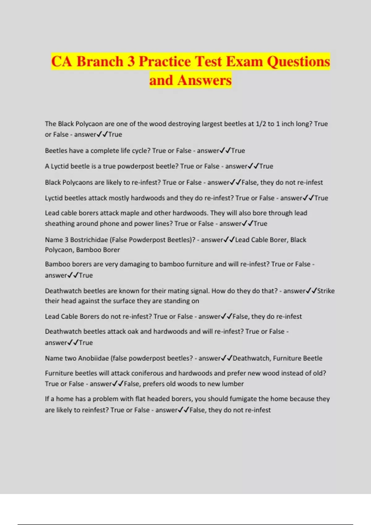 CA Branch 3 Practice Test Exam Questions and Answers The Black Polycaon are one of the wood destroying largest beetles at 1/2 to 1 inch long? True or False - answerTrue Beetles have a complete life cycle? True or False - answerTrue A Lyctid beetle is a true powderpost beetle? True or False - answerTrue Black Polycaons are likely to re-infest? True or False - answerFalse, they do not re-infest Lyctid beetles attack mostly hardwoods and they do re-infest? True or False - answerTrue Lead cable borers attack maple and other hardwoods. They will also bore through lead sheathing around phone and power lines? True or False - answerTrue Name 3 Bostrichidae (False Powderpost Beetles)? - answerLead Cable Borer, Black Polycaon, Bamboo Borer Bamboo borers are very damaging to bamboo furniture and will re-infest? True or False - answerTrue Deathwatch beetles are known for their mating signal. How do they do that? - answerStrike their head against the surface they are standing on Lead Cable Borers do not re-infest? True or False - answerFalse, they do re-infest Deathwatch beetles attack oak and hardwoods and will re-infest? True or False - answerTrue Name two Anobiidae (false powderpost beetles? - answerDeathwatch, Furniture Beetle Furniture beetles will attack coniferous and hardwoods and prefer new wood instead of old? True or False - answerFalse, prefers old woods to new lumber If a home has a problem with flat headed borers, you should fumigate the home because they are likely to reinfest? True or False - answerFalse, they do not re-infest New house borers prefer old seasoned wood? True or False - answerFalse, they attack green lumber, likes pines, firs and especially Douglas fir. Will bore through hardwoods, plaster, comp. roofing and linoleum to emerge. May be brought in with new lumber and firewood. Old house borers prefer new/fresh wood? True or False - answerFalse, attacks seasoned wood. Prefers pine, fir and spruce. Will attack rustic furniture. Bark beetles don't really bore through bark to star their tunnels? True or False - answerFalse, they bore through bark and work between bark and sapwood and often leave a scoring mark. Eggs are laid in their tunnels. If you see wood damaged by a new house borer, it will need to be treated because they will re- infest? True or False - answerFalse, do not re-infest and they cannot survive in seasoned wood. Name a Buprestidae Beetle? - answerFlat Headed Borer What does frass from a lyctid beetle look like? - answerTalcum powder-like, packed in channels but will fall freely from emergence holes. Flat headed borer emergence holes are oval shaped and about 3/8 inch wide? True or False - answerTrue Bark beetles are a serious pest of our forest but may be brought in with firewood? True or False - answerTrue New house borers may bore through hardwoods, plaster, composition roofing and linoleum to emerge but they do not require treatment because they will not re-infest? True or False - answerTrue Bark beetles do no re-infest? True or False - answerTrue Black polycaon emergence holes that are about 1/4 inch in diameter? True or False - answerTrue You can tell the difference between a true powderpost and false powderpost beetle's frass because only a true powderpost beetle has a fine "face-powder" like consistency? True or False - answerTrue Lyctid beetle emergence holes are about 1/32nd to 1/16th inch in diameter? True or False - answerTrue Will a bamboo borer re-infest? True or False - answerTrue Furniture beetle emergence holes are about 1/16th to 1/8th inch in diameter and they will re- infest? True or False - answerTrue Old house borers do not live in the U.S. but may be imported? True or False - answerTrue A new house borer may emerge from a new home a few moths to a year after it is built? True or False - answerTrue If you see a beetle infestation in a home, it always means that the treatment is needed? True or False - answerFalse Seasoned or kiln dried wood is a good choice for building because it is less likely to have problems with beetle infestations? True or False - answerTrue Before starting any control program, you need to determine which of the following? a)Make a positive identification of the beetle b)Find out if the beetle will re-infest c)Can the beetle survive in your climate d)Does the beetle prefer dry or seasoned wood e) Does the beetle need moisture to survive f)Is the damage current or is if from the past g)All the above - answerg)All the above Some beetle infestations can be controlled with residual liquid treatments? True or False - answerTrue Fumigation will give immediate control and kill all stages of powder post and death watch beetles. What dosage of sulfuryl fluoride will be needed to be effective? - answer10x Small items, such as furniture, may be fumigated in a small vault instead of fumigating the entire structure? True or False - answerTrue Methyl bromide works very well and is commonly used to fumigate homes all over California? True or False - answerFalse, it is almost never used except in specially assigned fumigation facilities or vaults. Extreme cold or heat will kill off all stages of beetles and may be used for treating sensitive items, such as piano? - answerFalse, will only kill some beetles because some are much harder to eradicate and may require much lower or higher temperatures to kill off all stages of growth. Which species of termite is the largest? - answerDampwood