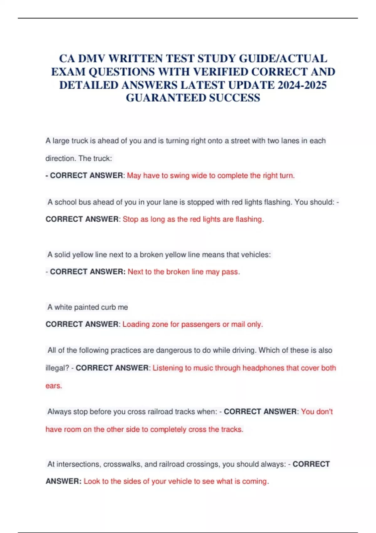 CA DMV WRITTEN TEST STUDY GUIDE/ACTUAL EXAM QUESTIONS WITH VERIFIED CORRECT AND DETAILED ANSWERS LATEST UPDATE GUARANTEED SUCCESS