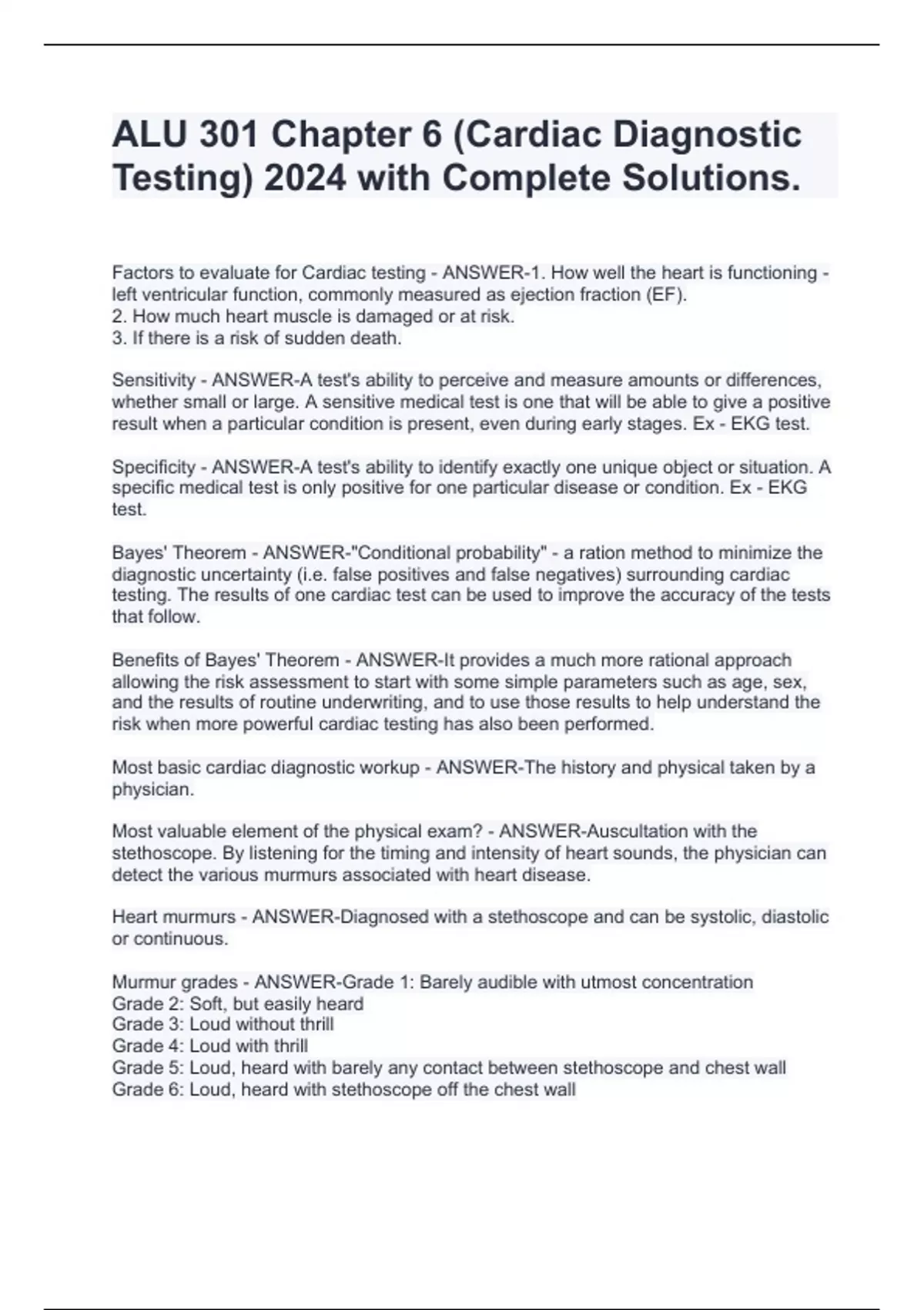 Factors to evaluate for Cardiac testing - ANSWER-1. How well the heart is functioning - left ventricular function, commonly measured as ejection fraction (EF). 2. How much heart muscle is damaged or at risk. 3. If there is a risk of sudden death. Sensitivity - ANSWER-A test's ability to perceive and measure amounts or differences, whether small or large. A sensitive medical test is one that will be able to give a positive result when a particular condition is present, even during early stages. Ex - EKG test. Specificity - ANSWER-A test's ability to identify exactly one unique object or situation. A specific medical test is only positive for one particular disease or condition. Ex - EKG test. Bayes' Theorem - ANSWER-"Conditional probability" - a ration method to minimize the diagnostic uncertainty (i.e. false positives and false negatives) surrounding cardiac testing. The results of one cardiac test can be used to improve the accuracy of the tests that follow. Benefits of Bayes' Theorem - ANSWER-It provides a much more rational approach allowing the risk assessment to start with some simple parameters such as age, sex, and the results of routine underwriting, and to use those results to help understand the risk when more powerful cardiac testing has also been performed. Most basic cardiac diagnostic workup - ANSWER-The history and physical taken by a physician. Most valuable element of the physical exam? - ANSWER-Auscultation with the stethoscope. By listening for the timing and intensity of heart sounds, the physician can detect the various murmurs associated with heart disease. Heart murmurs - ANSWER-Diagnosed with a stethoscope and can be systolic, diastolic or continuous. Murmur grades - ANSWER-Grade 1: Barely audible with utmost concentration Grade 2: Soft, but easily heard Grade 3: Loud without thrill Grade 4: Loud with thrill Grade 5: Loud, heard with barely any contact between stethoscope and chest wall Grade 6: Loud, heard with stethoscope off the chest wall Pericardial friction rub - ANSWER-A superficial, high-pitched, or scratchy sound that is