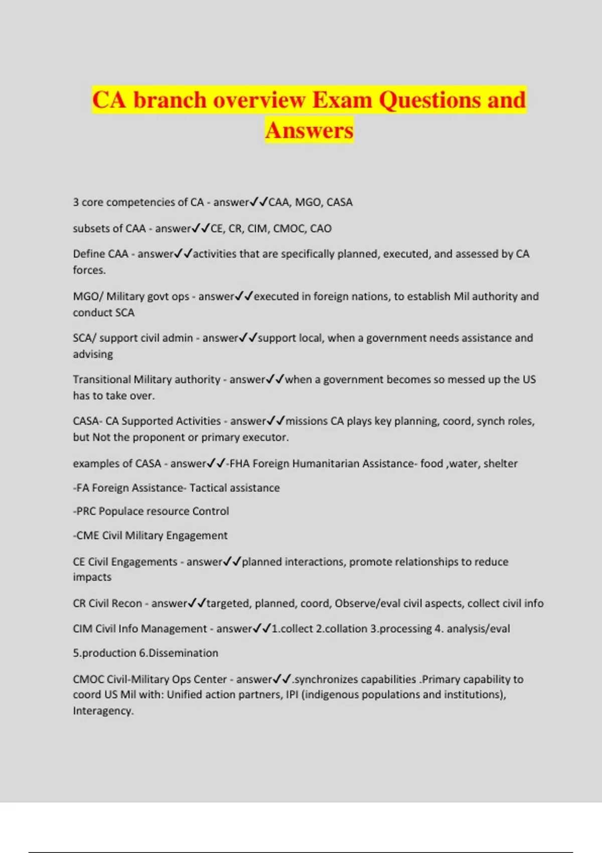 CA branch overview Exam Questions and Answers 3 core competencies of CA - answerCAA, MGO, CASA subsets of CAA - answerCE, CR, CIM, CMOC, CAO Define CAA - answeractivities that are specifically planned, executed, and assessed by CA forces. MGO/ Military govt ops - answerexecuted in foreign nations, to establish Mil authority and conduct SCA SCA/ support civil admin - answersupport local, when a government needs assistance and advising Transitional Military authority - answerwhen a government becomes so messed up the US has to take over. CASA- CA Supported Activities - answermissions CA plays key planning, coord, synch roles, but Not the proponent or primary executor. examples of CASA - answer-FHA Foreign Humanitarian Assistance- food ,water, shelter -FA Foreign Assistance- Tactical assistance