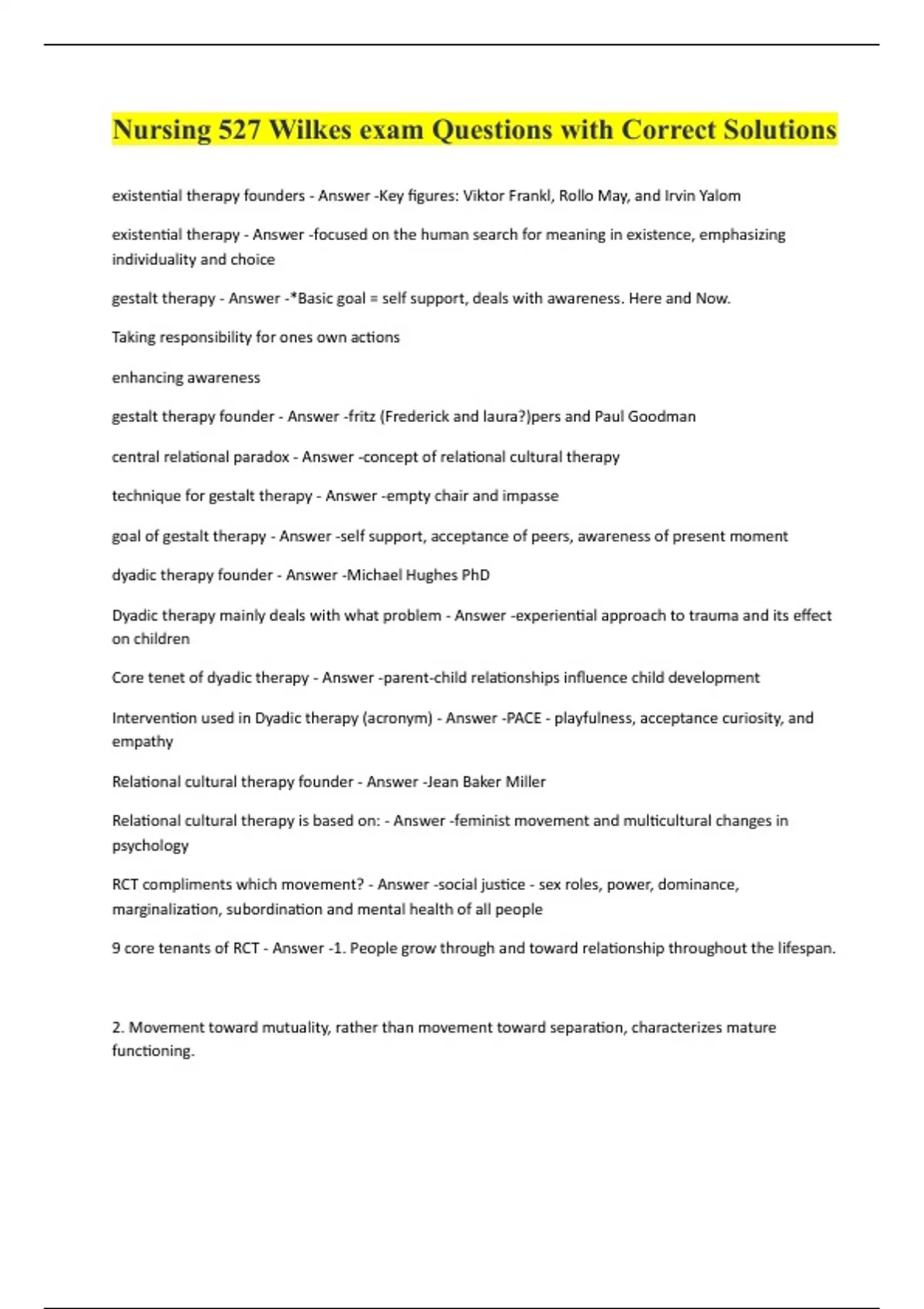 Nursing 527 Wilkes exam Questions with Correct Solutions existential therapy founders - Answer -Key figures: Viktor Frankl, Rollo May, and Irvin Yalom existential therapy - Answer -focused on the human search for meaning in existence, emphasizing individuality and choice gestalt therapy - Answer -*Basic goal = self support, deals with awareness. Here and Now. Taking responsibility for ones own actions enhancing awareness gestalt therapy founder - Answer -fritz (Frederick and laura?)pers and Paul Goodman central relational paradox - Answer -concept of relational cultural therapy technique for gestalt therapy - Answer -empty chair and impasse goal of gestalt therapy - Answer -self support, acceptance of peers, awareness of present moment dyadic therapy founder - Answer -Michael Hughes PhD Dyadic therapy mainly deals with what problem - Answer -experiential approach to trauma and its effect on children Core tenet of dyadic therapy - Answer -parent-child relationships influence child development Intervention used in Dyadic therapy (acronym) - Answer -PACE - playfulness, acceptance curiosity, and empathy Relational cultural therapy founder - Answer -Jean Baker Miller Relational cultural therapy is based on: - Answer -feminist movement and multicultural changes in psychology RCT compliments which movement? - Answer -social justice - sex roles, power, dominance, marginalization, subordination and mental health of all people 9 core tenants of RCT - Answer -1. People grow thro