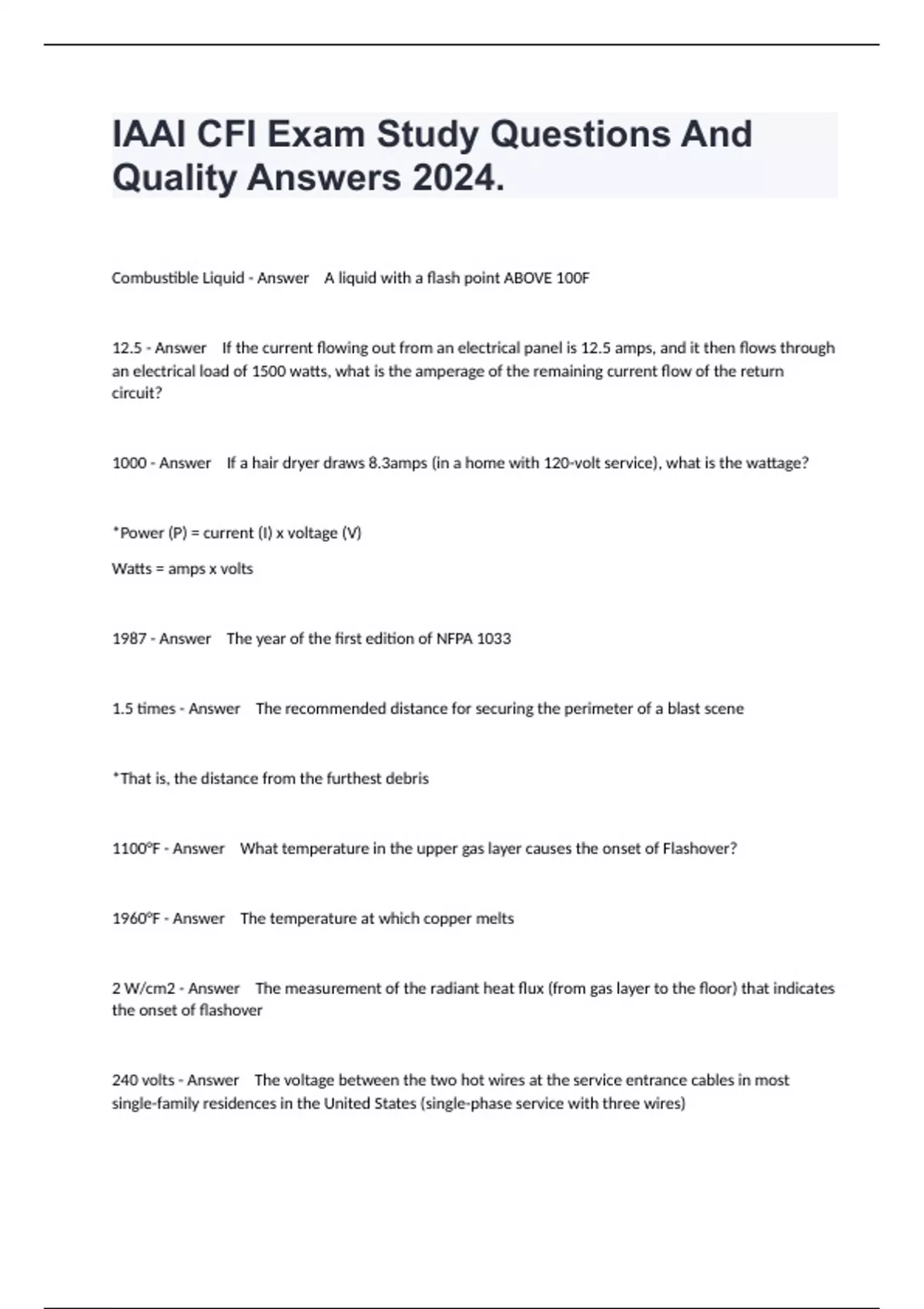 Combustible Liquid - Answer A liquid with a flash point ABOVE 100F 12.5 - Answer If the current flowing out from an electrical panel is 12.5 amps, and it then flows through an electrical load of 1500 watts, what is the amperage of the remaining current flow of the return circuit? 1000 - Answer If a hair dryer draws 8.3amps (in a home with 120-volt service), what is the wattage? *Power (P) = current (I) x voltage (V) Watts = amps x volts 1987 - Answer The year of the first edition of NFPA 1033 1.5 times - Answer The recommended distance for securing the perimeter of a blast scene *That is, the distance from the furthest debris 1100°F - Answer What temperature in the upper gas layer causes the onset of Flashover? 1960°F - Answer The temperature at which copper melts 2 W/cm2 - Answer The measurement of the radiant heat flux (from gas layer to the floor) that indicates the onset of flashover 240 volts - Answer The voltage between the two hot wires at the service entrance cables in most single-family residences in the United States (single-phase service with three wires)