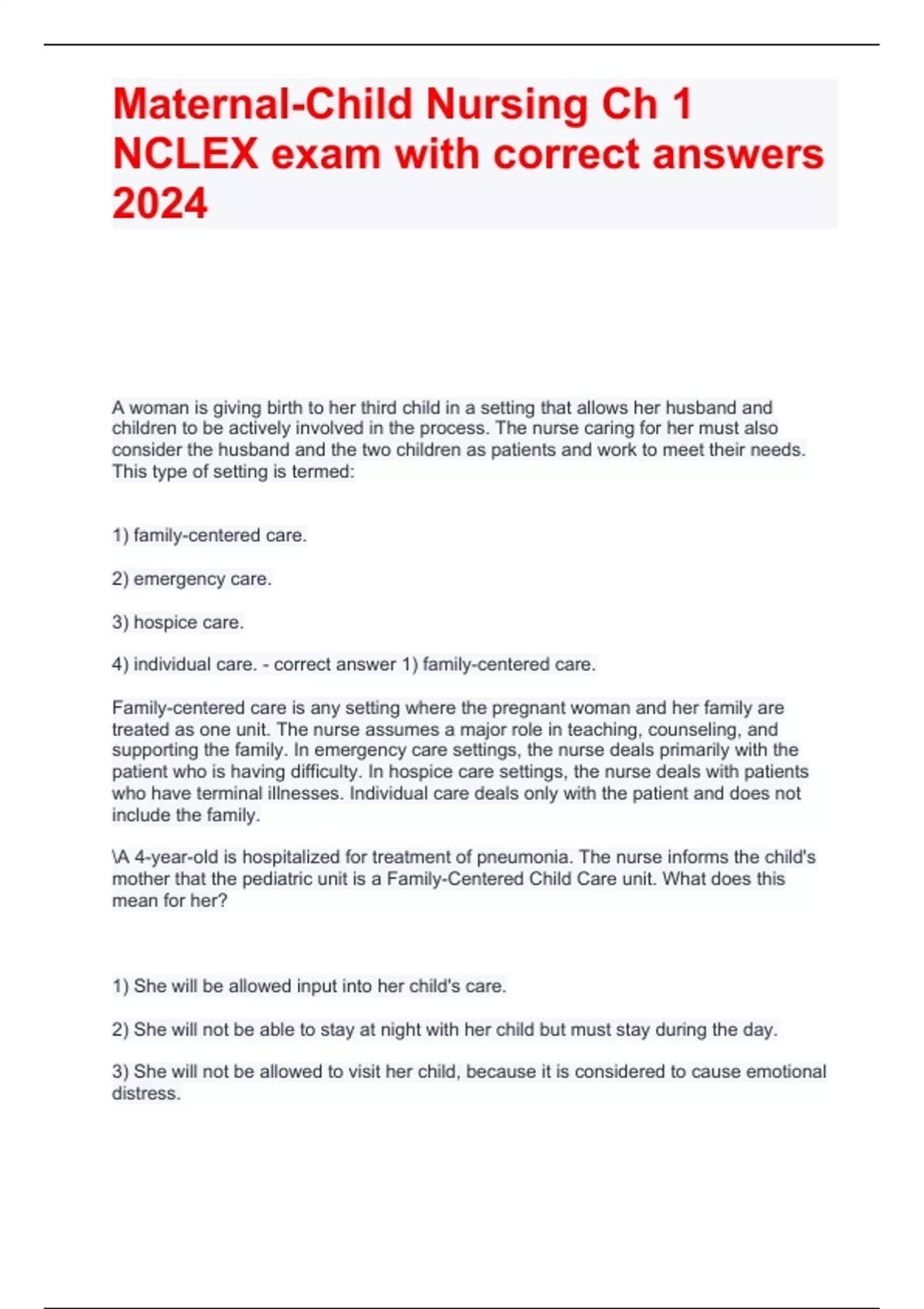 A woman is giving birth to her third child in a setting that allows her husband and children to be actively involved in the process. The nurse caring for her must also consider the husband and the two children as patients and work to meet their needs. This type of setting is termed: 1) family-centered care. 2) emergency care. 3) hospice care. 4) individual care. - correct answer 1) family-centered care. Family-centered care is any setting where the pregnant woman and her family are treated as one unit. The nurse assumes a major role in teaching, counseling, and supporting the family. In emergency care settings, the nurse deals primarily with the patient who is having difficulty. In hospice care settings, the nurse deals with patients who have terminal illnesses. Individual care deals only with the patient and does not include the family. A 4-year-old is hospitalized for treatment of pneumonia. The nurse informs the child's mother that the pediatric unit is a Family-Centered Child Care unit. What does this mean for her? 1) She will be allowed input into her child's care. 2) She will not be able to stay at night with her child but must stay during the day. 3) She will not be allowed to visit her child, because it is considered to cause emotional distress. 4) She will be responsible for her child'