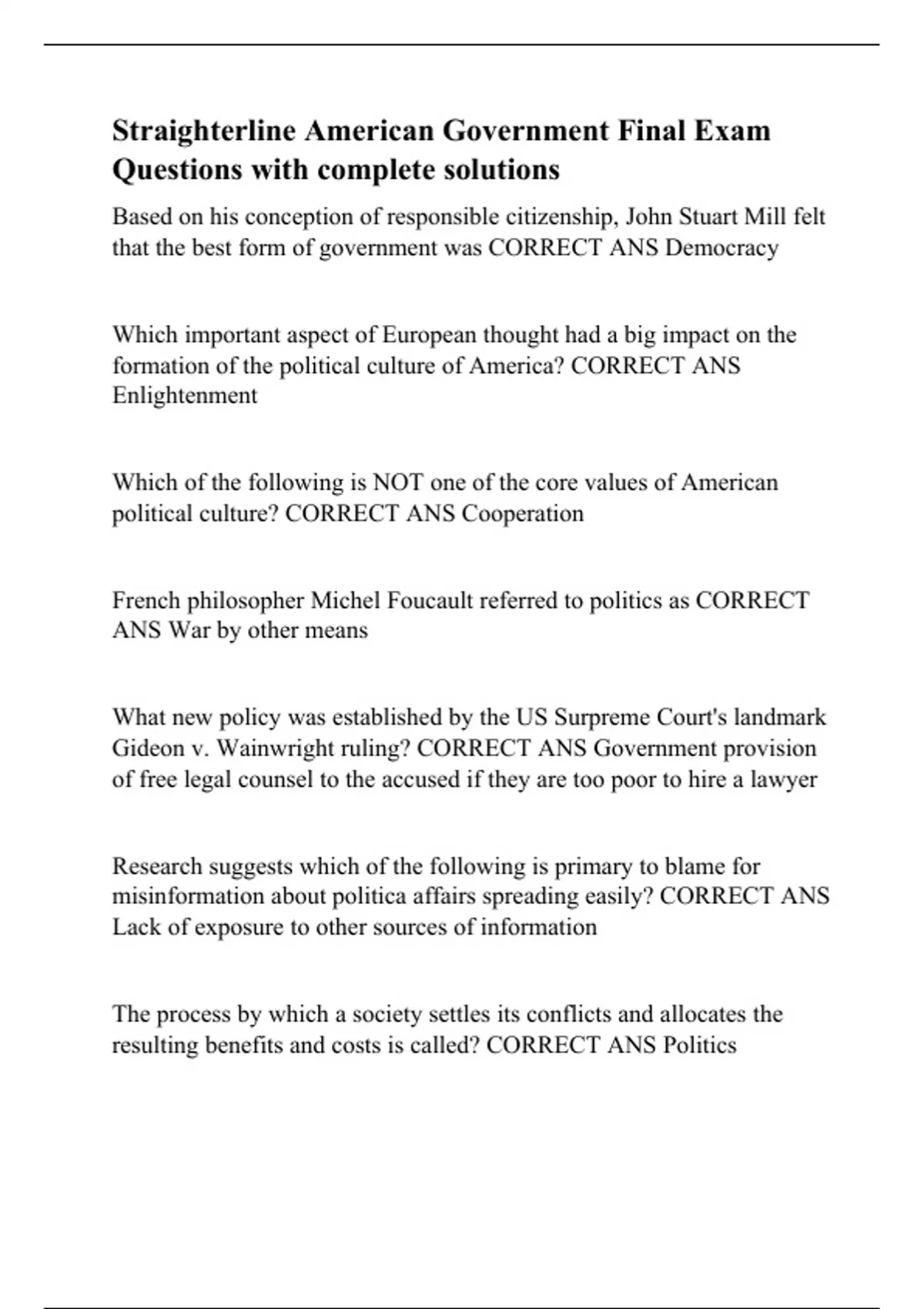Straighterline American Government Final Exam Questions with complete solutions