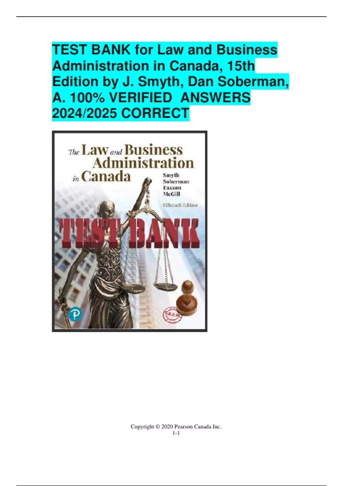 BEST ANSWERS TEST BANK for Law and Business Administration in Canada, 15th Edition by J. Smyth, Dan Soberman, A. 100% VERIFIED ANSWERS 2024/2025 CORRECT