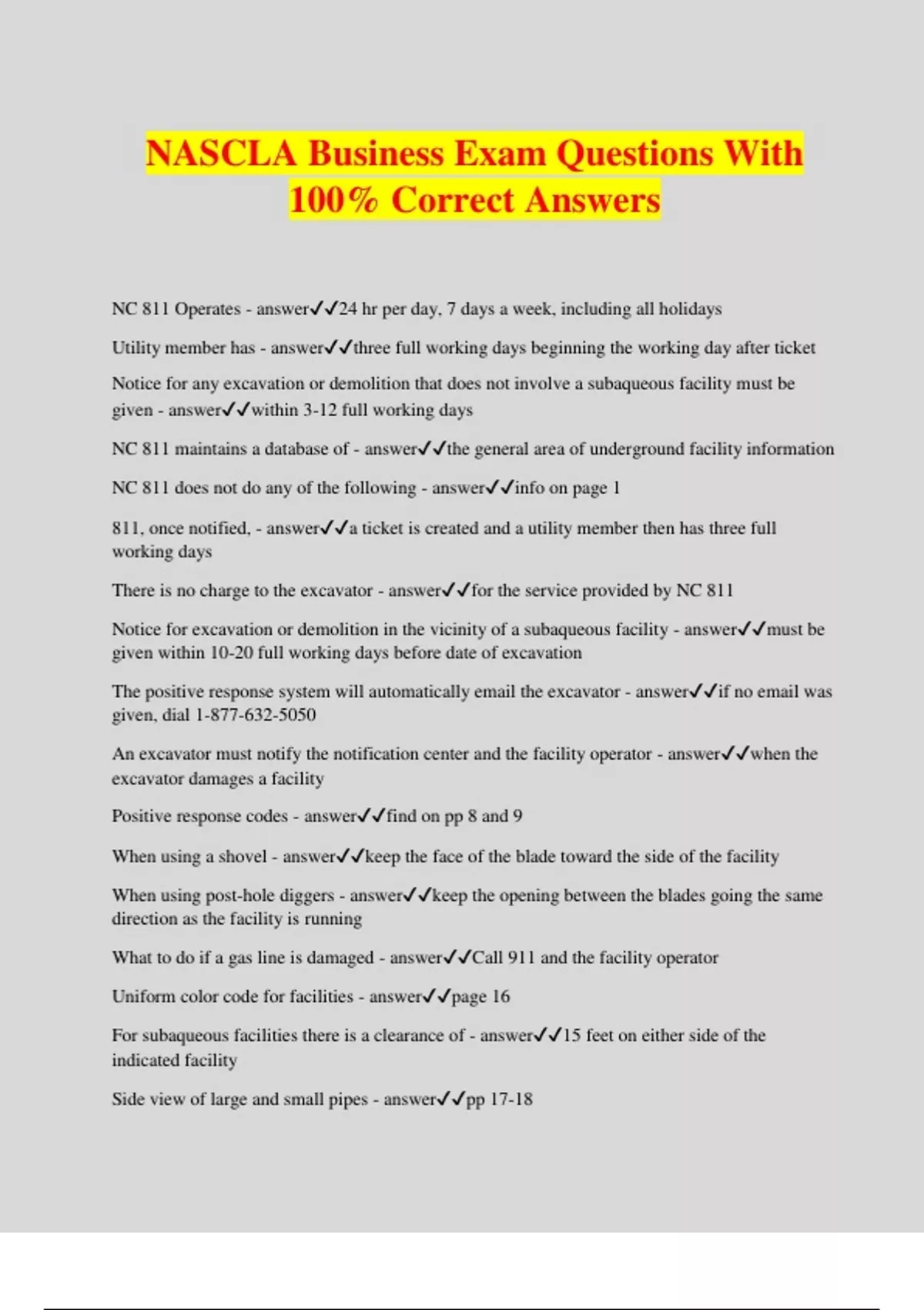 NASCLA Business Exam Questions With 100% Correct Answers NC 811 Operates - answer24 hr per day, 7 days a week, including all holidays Utility member has - answerthree full working days beginning the working day after ticket Notice for any excavation or demolition that does not involve a subaqueous facility must be given - answerwithin 3-12 full working days NC 811 maintains a database of - answerthe general area of underground facility information NC 811 does not do any of the following - answerinfo on page 1 811, once notified, - answera ticket is created and a utility member then has three full working days There is no charge to the excavator - answerfor the service provided by NC 811 Notice for excavation or demolition in the vicinity of a subaqueous facility - answermust be given within 10-20 full working days before date of excavation The positive response system will automatically email the excavator - answerif no email was given, dial An excavator must notify the notification center and the facility operator - answerwhen the excavator damages a facility Positive response codes - answerfind on pp 8 and 9 When using a shovel - answerkeep the face of the blade toward the side of the facility When using post-hole diggers - answerkeep the opening between the blades going the same direction as the facility is running What to do if a gas line is damaged - answerCall 911 and the facility operator Uniform color code for facilities - answerpage 16 For subaqueous facilities there is a clearance of - answer15 feet on either side of the indicated facility Side view of large and small pipes - answerpp 17-18