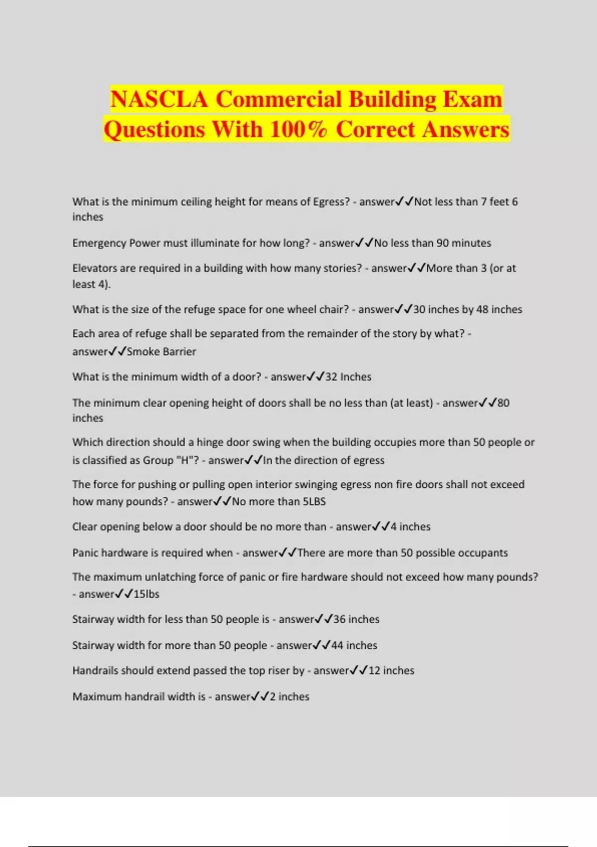 NASCLA Commercial Building Exam Questions With 100% Correct Answers What is the minimum ceiling height for means of Egress? - answerNot less than 7 feet 6 inches Emergency Power must illuminate for how long? - answerNo less than 90 minutes Elevators are required in a building with how many stories? - answerMore than 3 (or at least 4). What is the size of the refuge space for one wheel chair? - answer30 inches by 48 inches Each area of refuge shall be separated from the remainder of the story by what? - answerSmoke Barrier What is the minimum width of a door? - answer32 Inches The minimum clear opening height of doors shall be no less than (at least) - answer80 inches Which direction should a hinge door swing when the building occupies more than 50 people or is classified as Group "H"? - answerIn the direction of egress The force for pushing or pulling open interior swinging egress non fire doors shall not exceed how many pounds? - answerNo more than 5LBS Clear opening below a door should be no more than - answer4 inches Panic hardware is required when - answerThere are more than 50 possible occupants The maximum unlatching force of panic or fire hardware should not exceed how many pounds? - answer15lbs Stairway width for less than 50 people is - answer36 inches Stairway width for more than 50 people - answer44 inches Handrails should extend passed the top riser by - answer12 inches Maximum handrail width is - answer2 inches Where handrails are not continuous between flights, the handrails should extend horizontally how many inches? - answer12 inches Clear space between handrail and wall - answer1 1/2 Required guards shall not have an opening how large? - answer4 inches Corridor width chart can be found in what book? - answer2018 IBC (Thick blue book) page 287 Emergency escape and rescue openings shall have the bottom of the opening not greater than how many inches? - answer44 inches measure from floor Accessible parking Spaces chart can be found where? - answer2018 IBC Page 308 Net Free Ventilating area shall not be less than - answer1/150th of the area of the space ventilated (Page 321 IBC) The spacing of the ties or fastenings for exterior metal veneer shall not exceed how many inches? - answer24 inches Lap siding should have minimum lap of how many inches? - answer1 and 1/4 inches Metal flashing on walls, roof intersections, no less than how thick? - answer0.019 What class assemblies are most effective against severe fire test? - answerClass A Asphalt shingles should only be used on roof slopes - answerOf two units vertical in 12 units horizontal (17%) Valley lining material thickness chart can be found where? - answerIBC 351 Wood Shake and Wood shingle exposure table - answerIBC 352 Minimum Slope of a roof is - answer1/4 : 1 Allowable deflection table can be found - answerIBC 363 A geotechnical investigation must be conducted when: - answerWhen backfilling more than 12inches under a footer The grade away from a building must be - answer5% for at least 10 feet Dampproofing must be applied from where? - answerFooter to above grade Where should a foundation drain be placed? - answerTop of the drain at least 6 inches above the top of the footing, filter fabric over stone Sandy, silty sand, clayey, table - found where? - answer434 IBC Backfill compressive strength has to be what PSI? - answerAt least 2000 PSI Minimum Depth of footings below undisturbed ground surface should be how deep? - answer12 inches Minimum width of footing is - answer12 inches Flange projections shall not exceed what dimension? - answer14 times the minimum thickness of metal and flange width shall not be less than 80% of the depth of the section How thick should a vapor barrier be below a slab? - answer6 mil (0.006) lapped at least 6 inches Chimney termination is at least how far above the highest point of the roof? - answer3 feet What plan is submitted to the engineer? - answerDesign (construction documents) Steel Joist placement plans do not require what - answerSeal and signature of the joist manufacturer Trusses spanning more than how many feet require an engineer? - answer60ft Underlayment should be a minimum of how thick? - answer1/4in thick At what height do you need a permit for a retaining wall? - answer4ft What occupancy classification is a hospital? - answerI-2 Who is authorized to serve a notice of violation or revoke permit? - answerThe Building Official Fire box should be placed how far above finished floor? - answer42-48inches Minimum temperature when applying SFRM is what - answer40 Degrees for 24 hours Parapet shall not be less than how tall above the point where the roof surface and wall intersect? - answer30 inches Smoke barriers most be how thick? - answer2.5mm (.10in) Shaft enclosures shall have a fire resistance rating of not less than how long? - answer2 hours where connecting 4 stories or more A manual actuation device shall be located at or near egress how far from cooking area? - answer10-20ft