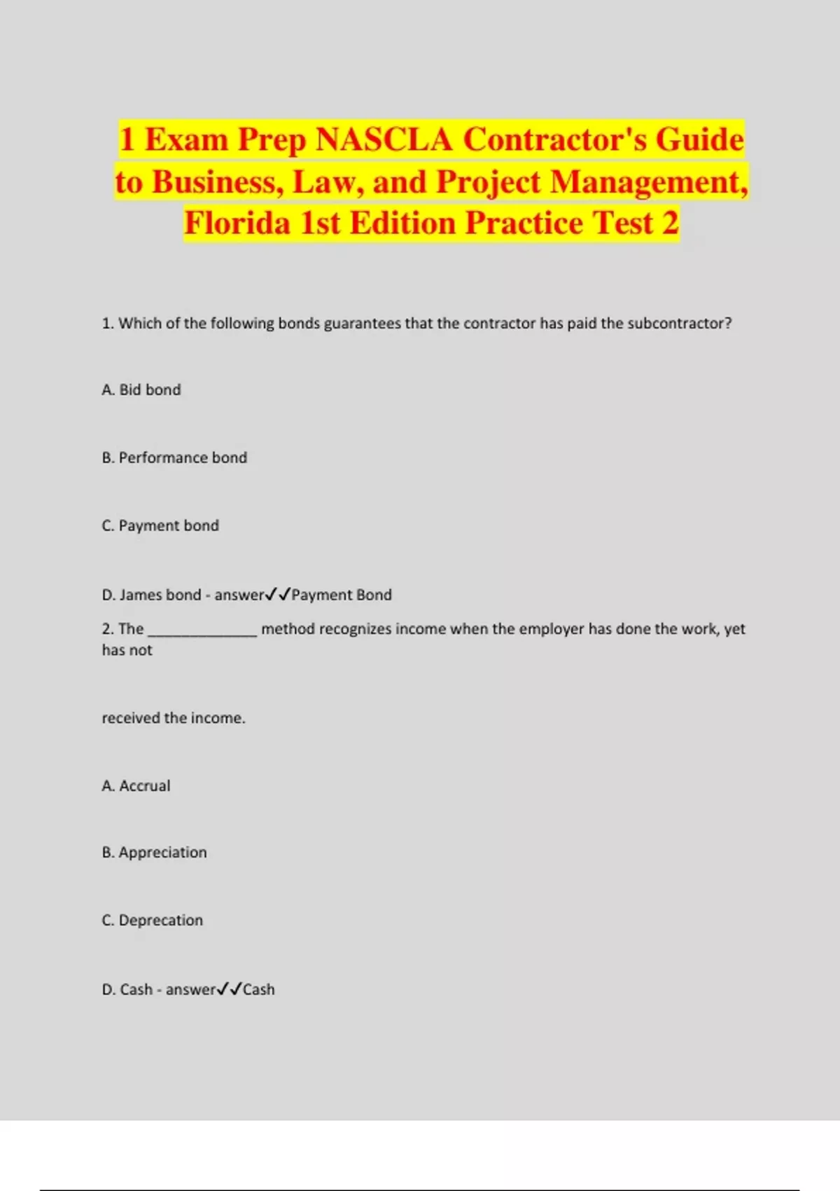 1 Exam Prep NASCLA Contractor's Guide to Business, Law, and Project Management, Florida 1st Edition Practice Test 2 1. Which of the following bonds guarantees that the contractor has paid the subcontractor? A. Bid bond B. Performance bond C. Payment bond D. James bond - answerPayment Bond 2. The _____________ method recognizes income when the employer has done the work, yet has not received the income. A. Accrual B. Appreciation C. Deprecation D. Cash - answerCash 3. A ___________________ bundles all cost factors for entire task. A. Lump sum B. Cost plus C. Percent completion method D. Unit price method - answerUnit Price Method 4. _______________ requires paying prevailing wages in federally-financed projects. A. Service Contract Act B. Walsh-Healey Act C. Wage Garnishment Law D. Davis-Bacon Act - answerService Contract Act 5. ________________ absolves the indemnified party from any payment for losses and damages incurred by a third party. A. Indemnification B. Delays and extensions of time C. Schedule acceleration D. Force majeure - answerSchedule acceleration 6. The EAP should include ______________. A. Student's name B. Employer's name C. Administrator's name D. Next of kin - answerEmployer's Name 7. The MSDS provides for two main purposes: one purpose is product information, the other purpose is _______________ information. A. Substance B. Chemical C. Sequence of activities D. Emergency contact - answerEmergency Contract 8. Having adequate technology strengths can help an organization with all except the following? A. Estimating B. Purchasing C. Scheduling D. Vacationing - answerEstimating 9. Which of the following is an exclusion to an advantage of a sole proprietor? A. Limited personal responsibility B. Low start up costs C. Ownership of profits D. Decision making freedom - answerOwnership of profits 10. _________________ determine the type of materials or methods used. A. Specifications B. Building codes C. References D. UL - answerSpecifications 11. Which of the following pays a worker when he, she, is laid off? A. Worker's compensation