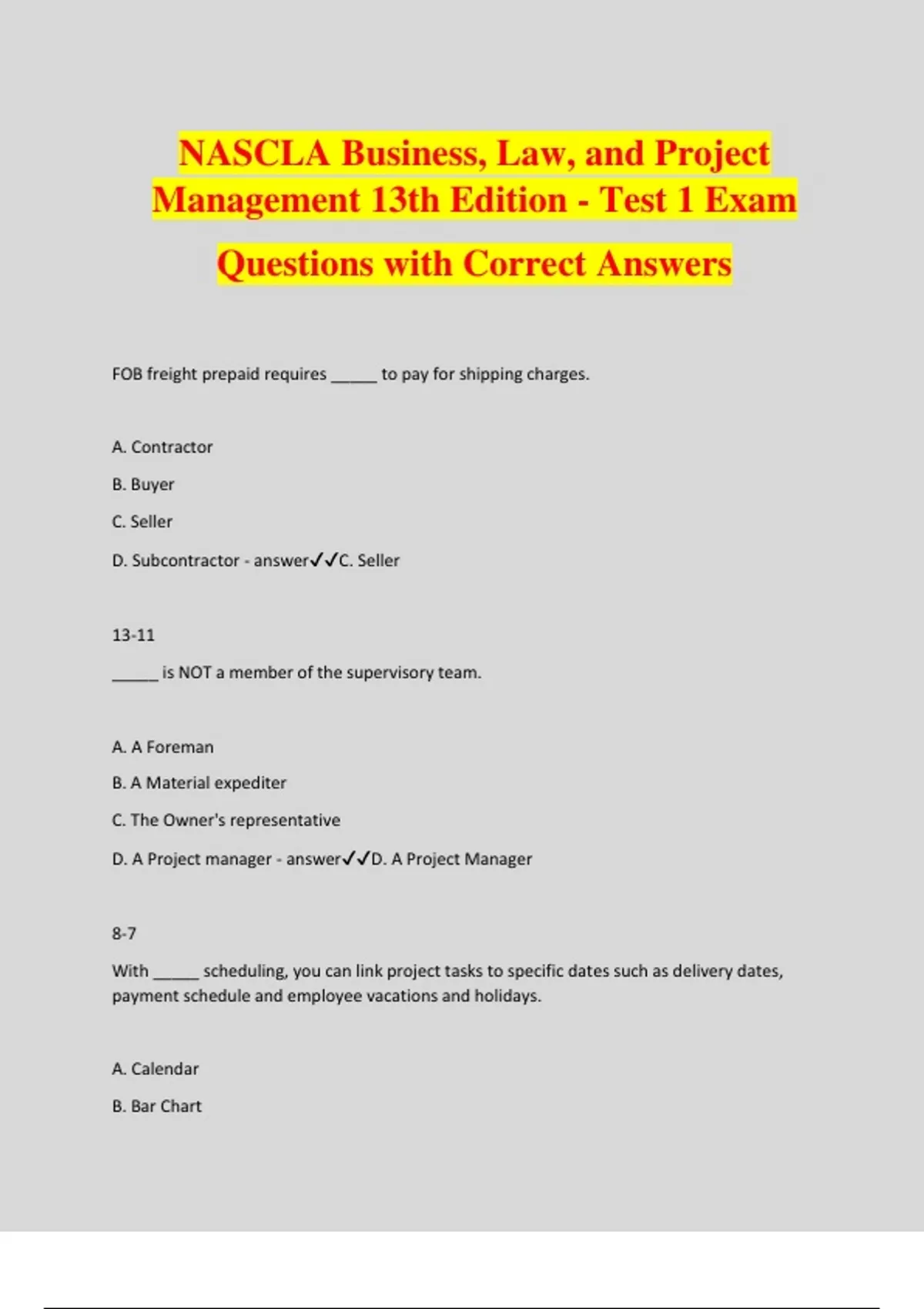 NASCLA Business, Law, and Project Management 13th Edition - Test 1 Exam Questions with Correct Answers FOB freight prepaid requires _____ to pay for shipping charges. A. Contractor B. Buyer C. Seller D. Subcontractor - answerC. Seller 13-11 _____ is NOT a member of the supervisory team. A. A Foreman B. A Material expediter C. The Owner's representative D. A Project manager - answerD. A Project Manager 8-7 With _____ scheduling, you can link project tasks to specific dates such as delivery dates, payment schedule and employee vacations and holidays. A. Calendar B. Bar Chart C. Gantt D. Critical Path Method - answerA. Calendar 8-3 When working in dwelling that was built prior to 1978, the employer is to provide each occupant with a pamphlet titled _____. A. Protect your family from lead in your home B. Protect you loved ones from lead in your home C. Protect your family and your friends from lead in your home D. Pamphlets are not required - answerA. Protect your family from lead in your home 11-13 Employers that violate child labor laws are subject to civil penalty of up to _____ per worker for each violation. A. $2,500 B. $5,000 C. $10,000 D. $11,000 - answerD. $11,000 10-3 A lump sum contract on a project has a total contract price of $260,000. Retainage has been held back at 10%. The contractor has received progress payments for 75% of the project. The contractor submits a request for final payment for _____. A. More than $80,000 B. Less than $50,000