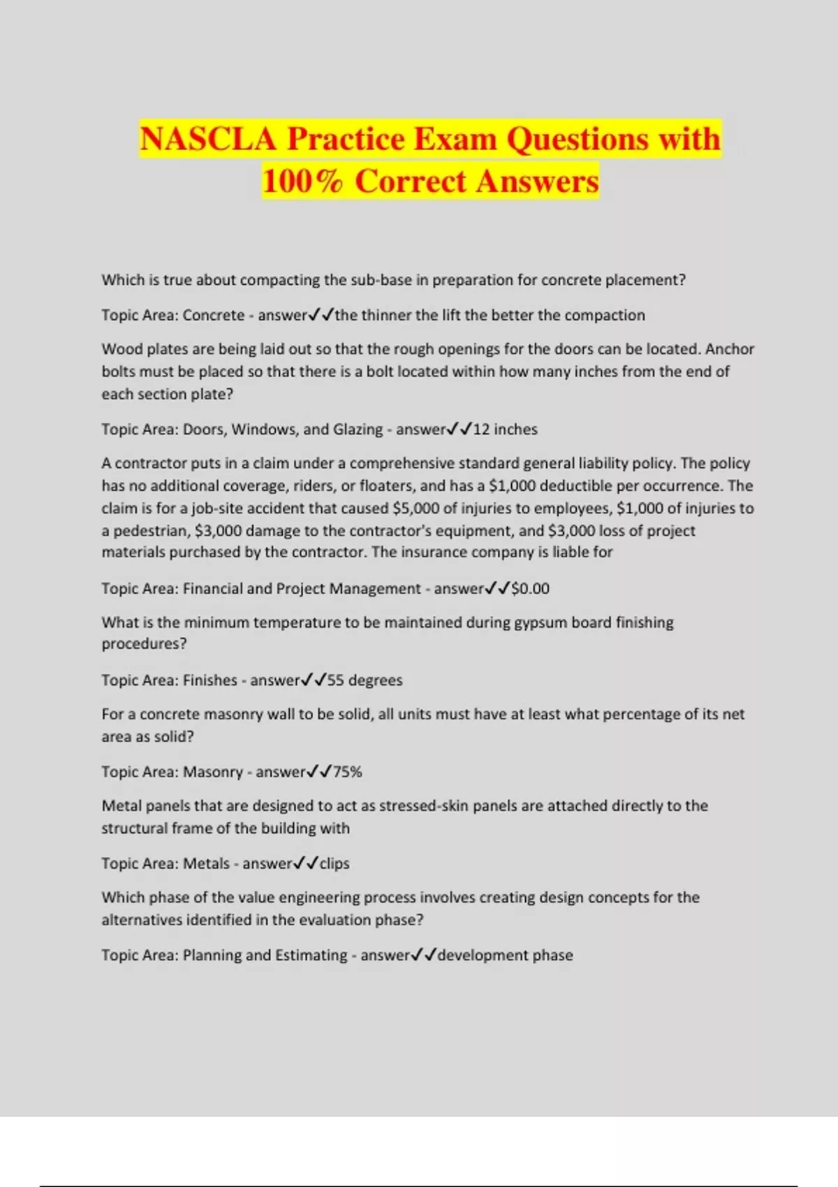 NASCLA Practice Exam Questions with 100% Correct Answers Which is true about compacting the sub-base in preparation for concrete placement? Topic Area: Concrete - answerthe thinner the lift the better the compaction Wood plates are being laid out so that the rough openings for the doors can be located. Anchor bolts must be placed so that there is a bolt located within how many inches from the end of each section plate? Topic Area: Doors, Windows, and Glazing - answer12 inches A contractor puts in a claim under a comprehensive standard general liability policy. The policy has no additional coverage, riders, or floaters, and has a $1,000 deductible per occurrence. The claim is for a job-site accident that caused $5,000 of injuries to employees, $1,000 of injuries to a pedestrian, $3,000 damage to the contractor's equipment, and $3,000 loss of project materials purchased by the contractor. The insurance company is liable for Topic Area: Financial and Project Management - answer$0.00 What is the minimum temperature to be maintained during gypsum board finishing procedures? Topic Area: Finishes - answer55 degrees