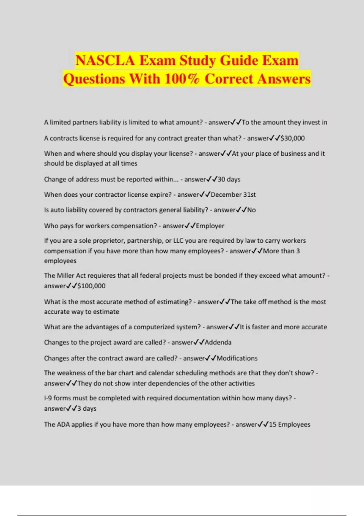 NASCLA Exam Study Guide Exam Questions With 100% Correct Answers A limited partners liability is limited to what amount? - answerTo the amount they invest in A contracts license is required for any contract greater than what? - answer$30,000 When and where should you display your license? - answerAt your place of business and it should be displayed at all times Change of address must be reported within... - answer30 days When does your contractor license expire? - answerDecember 31st Is auto liability covered by contractors general liability? - answerNo Who pays for workers compensation? - answerEmployer If you are a sole proprietor, partnership, or LLC you are required by law to carry workers compensation if you have more than how many employees? - answerMore than 3 employees The Miller Act requieres that all federal projects must be bonded if they exceed what amount? - answer$100,000 What is the most accurate method of estimating? - answerThe take off method is the most accurate way to estimate