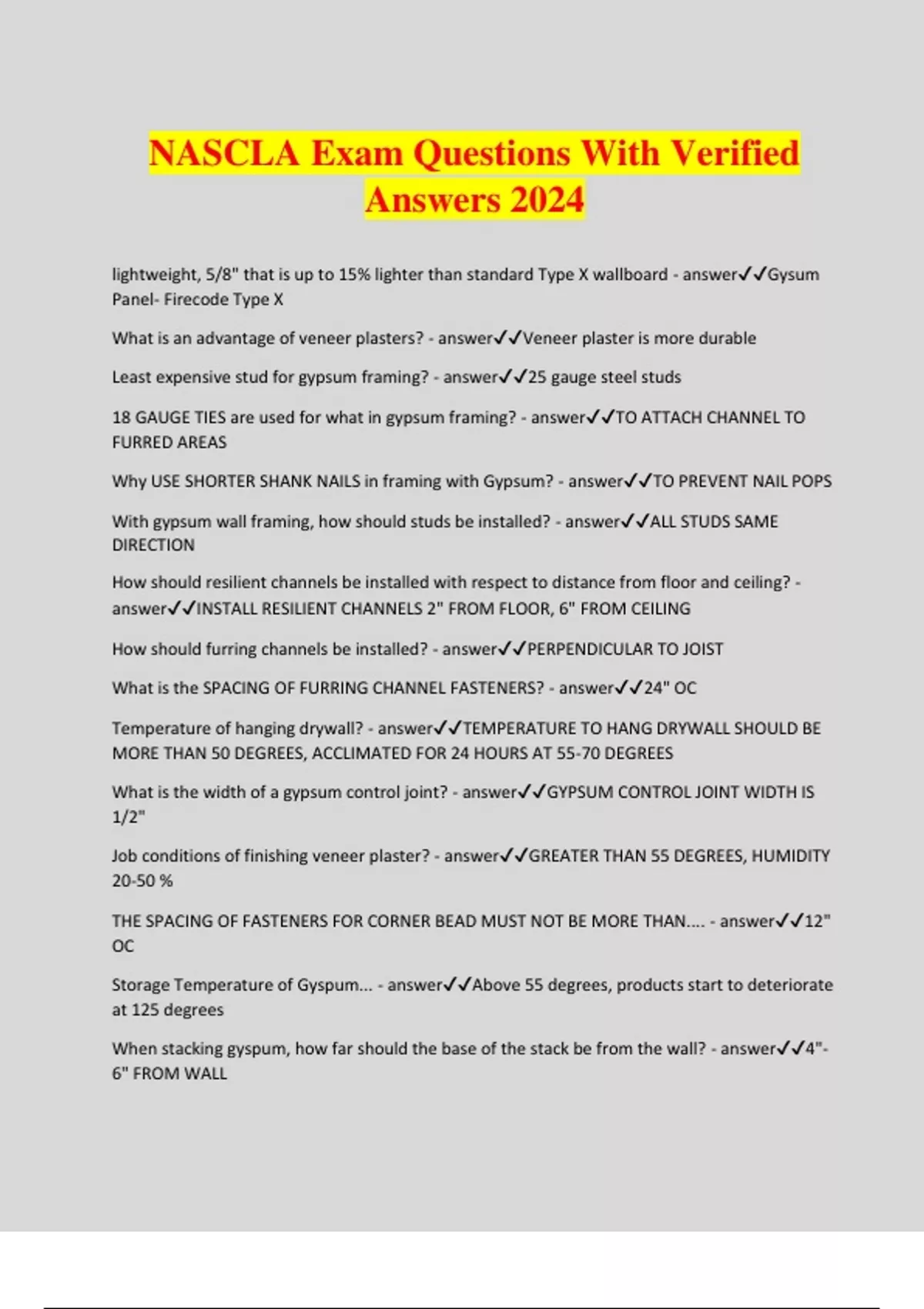 NASCLA Exam Questions With Verified Answers 2024 lightweight, 5/8" that is up to 15% lighter than standard Type X wallboard - answerGysum Panel- Firecode Type X What is an advantage of veneer plasters? - answerVeneer plaster is more durable Least expensive stud for gypsum framing? - answer25 gauge steel studs 18 GAUGE TIES are used for what in gypsum framing? - answerTO ATTACH CHANNEL TO FURRED AREAS Why USE SHORTER SHANK NAILS in framing with Gypsum? - answerTO PREVENT NAIL POPS With gypsum wall framing, how should studs be installed? - answerALL STUDS SAME DIRECTION How should resilient channels be installed with respect to distance from floor and ceiling? - answerINSTALL RESILIENT CHANNELS 2" FROM FLOOR, 6" FROM CEILING How should furring channels be installed? - answerPERPENDICULAR TO JOIST What is the SPACING OF FURRING CHANNEL FASTENERS? - answer24" OC Temperature of hanging drywall? - answerTEMPERATURE TO HANG DRYWALL SHOULD BE MORE THAN 50 DEGREES, ACCLIMATED FOR 24 HOURS AT 55-70 DEGREES What is the width of a gypsum control joint? - answerGYPSUM CONTROL JOINT WIDTH IS 1/2" Job conditions of finishing veneer plaster? - answerGREATER THAN 55 DEGREES, HUMIDITY 20-50 % THE SPACING OF FASTENERS FOR CORNER BEAD MUST NOT BE MORE THAN.... - answer12" OC Storage Temperature of Gyspum... - answerAbove 55 degrees, products start to deteriorate at 125 degrees When stacking gyspum, how far should the base of the stack be from the wall? - answer4"- 6" FROM WALL When can a door be used as a wall control joint? - answerTHE DOOR MAY BE USED AS A WALL CONTROL JOINT IF THE JOINT GOES FROM THE CORNER UP Some purposes of roofing underlayment? - answerIt protects roof sheathing before the roof is applied, and it gives added weather protection What is used to keep water from getting inside the roof? - answerIce Dams The membrane of an ice dam should be HOW MANY inches inside the wall line? - answer24 inches inside the wall line What is the term for flashing built into the vertical surface and bent down over the base flashing - answercounter flashing What is the flashing built right up on the chimney and butts the chimney and the shingles? - answerStep flashing How much exposure should be given when roll roofing? - answer17 inches How many pounds per square are required of vapor barriers on built up roofs? - answer45 to 80 lbs per square What are some purposes of aggregate on built up roofs? - answerProtects the underlying roof system from weather and protects from damage caused by foot traffic When installing rafters, how much air space should be left for ventilation? - answer1 inch minimum In roofing, what is a major reason to install vapor barriers? - answerPrevent condensation What is the term used to describe the ability of a vapor barrier to resist vapor penetration? - answer"Perms" What is the maximum height of carpet? - answer1/2 inch What is the max vertical change in level? - answer1/4" What is the max bevel allowed? - answer1:2 Max slope of any floor surface is... - answer1:48 Objects may protrude how many inches into the path of travel? - answer4 inches Max pressure for operable parts is what? - answer5 lbs Clear width of an interior accessible route is.... - answer36 inches minimum What is the max height of a threshold? - answer1/2 FOOT (6 in) Door hardware should be placed.... - answer34 to 48 inches above finished floor Opening door force should be.... - answer5 lbs Minimum ramp loading length? - answer60 inches Ramps higher than HOW MANY inches shall have handrails? - answer6 inches Ramp surface must extend how many inches outside the railing? - answer12 inches Curbs at ramps shall be at least how many inches high? - answer4 inches Parking space access aisles should be at least how many inches wide? - answer60 inches Stair risers shall be what max and min. height? - answer4 inches min, 7 inches max Handrail height shall be how many inches? - answer34-38 inches Stair handrails shall extend how many inches past the nosing? - answer12 inches past nosing Water closets shall be between how many inches from a side wall? - answer16 to 18 inches Grab bars shall be how many inches above the shower floor? - answer33 to 36 inches Grab bars should be able to support how many lbs? - answer250 lbs Front loading floor surface should be offset how many inches from the centerline? - answer24 inches How much space should there be between U-shaped kitchens? - answer60 inches A parking lot within 10 feet of a building may slope how much? - answer2% slope With the erection of precast concrete products, the rotation of the panel should be performed where? - answerOver the truck bed Dunnage should not be continuous over how much? - answerNot more than one stack Wall panel bracing must be maintained until.... - answerpermanent connections are accomplished Concrete panels help with what? - answerMore rapid construction When dry packing grout, joints need greater than how much spacing? - answerGreater than 1 inch Minimum temperature to grout panels is? - answer40 degrees Hollow core slab joints greater than 1/8" shall be.... - answerTaped Temporary shoring MUST stay in place until what? - answerAll members are bearing Precast concrete floor jacking post may be removed when? - answerWhen the grout has hardened What is the standard bearing depth for open web joists? - answer2 1/2" If a joist reads "14K7", what does the 7 indicate? - answerThe chord designation number How should you store joists? - answerStore them just as they are shipped, vertical, laid down-- all the above How should you attach bearing joists? - answerTack weld both sides of one end What is "sweep" in joists? - answerOutward bow of the joist How should cantilevered joists be braced? - answerUsing crossbracing In what lengths are joists panelized in order to accommodate standard bridging lengths? - answer20 feet What should be done if damage occurs to the joist? - answerIt should be reported to the joist manufacturer Who is allowed to modify a j