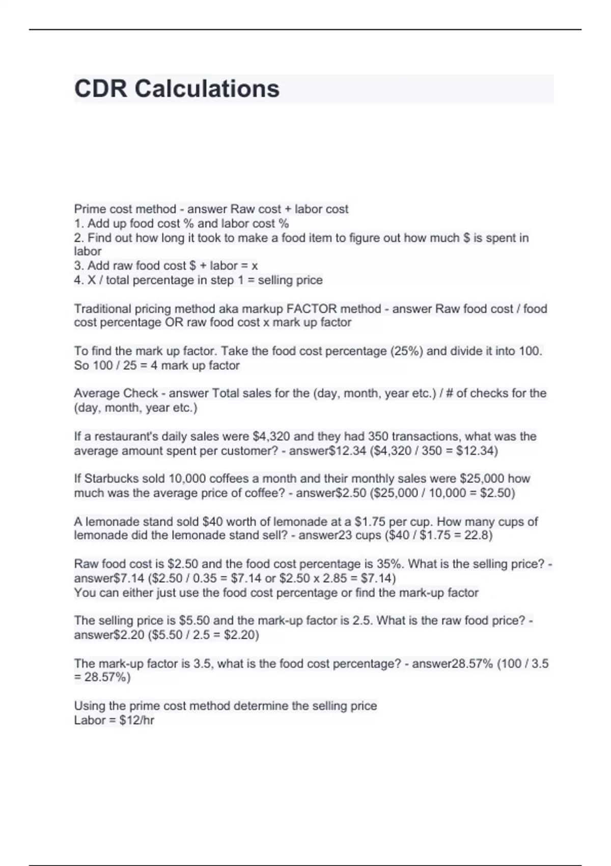 CDR Calculations Questions and Answers 2024