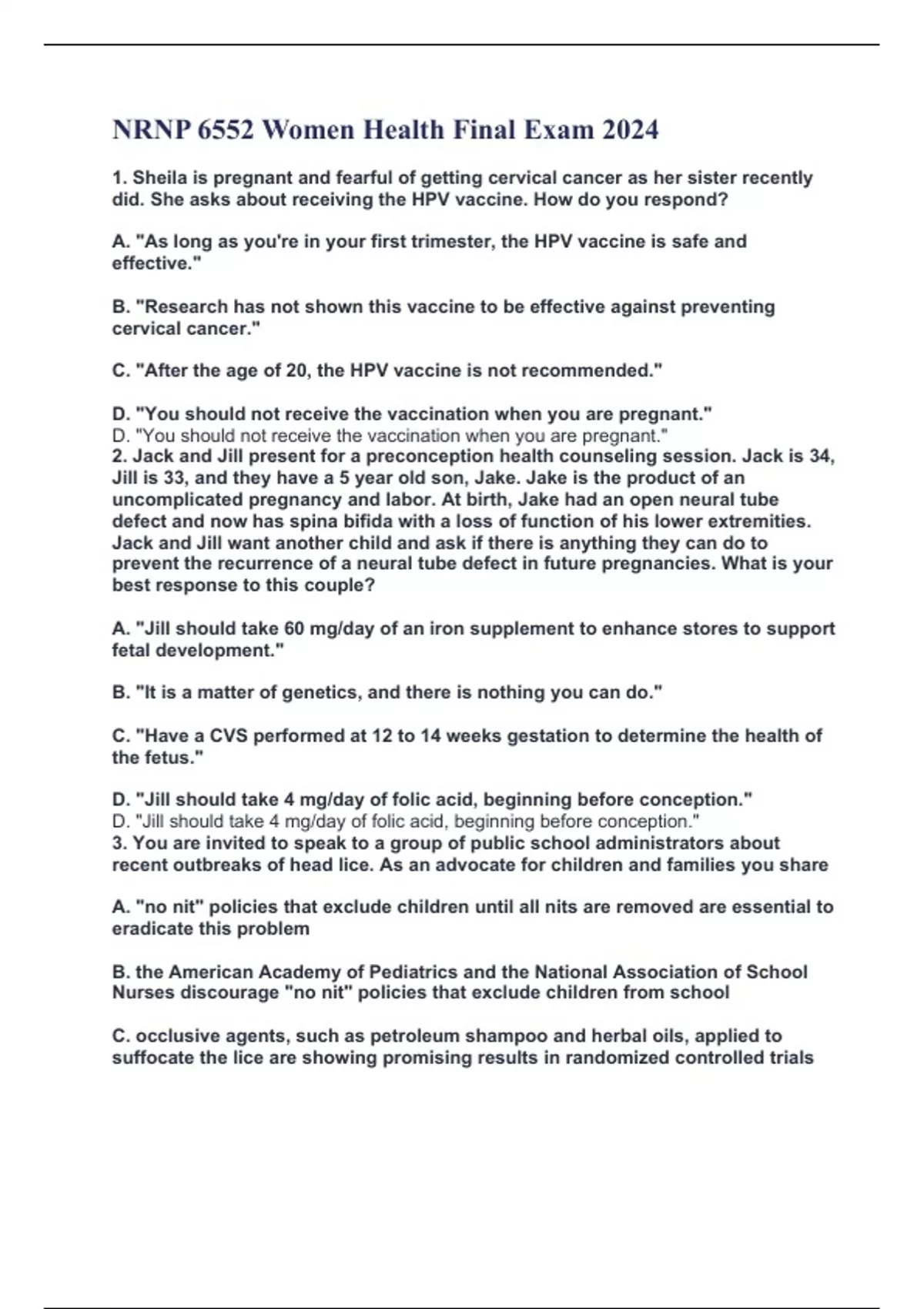 NRNP 6552 Women Health Final Exam 2024 1. Sheila is pregnant and fearful of getting cervical cancer as her sister recently did. She asks about receiving the HPV vaccine. How do you respond? A. "As long as you're in your first trimester, the HPV vaccine is safe and effective." B. "Research has not shown this vaccine to be effective against preventing cervical cancer." C. "After the age of 20, the HPV vaccine is not recommended." D. "You should not receive the vaccination when you are pregnant." D. "You should not receive the vaccination when you are pregnant." 2. Jack and Jill present for a preconception health counseling session. Jack is 34, Jill is 33, and they have a 5 year old son, Jake. Jake is the product of an uncomplicated pregnancy and labor. At birth, Jake had an open neural tube defect and now has spina bifida with a loss of function of his lower extremities. Jack and Jill want another child and ask if there is anything they can do to prevent the recurrence of a neural tube defect in future pregnancies. What is your best response to this couple? A. "Jill should take 60 mg/day of an iron supplement to enhance stores to support fetal development." B. "It is a matter of genetics, and there is nothing you can do." C. "Have a CVS performed at 12 to 14 weeks gestation to determine the health of the fetus." D. "Jill should take 4 mg/day of folic acid, beginning before conception." D. "Jill should take 4 mg/day of folic acid, beginning before conception." 3. You are invited to speak to a group of public school administrators about recent outbreaks of head lice. As an advocate for children and families you share A. "no nit" policies that exclude children until all nits are removed are essential to eradicate this problem B. the American Academy of Pediatrics and the National Association of School Nurses discourage "no nit" policies that exclude children from school C. occlusive agents, such as petroleum shampoo and herbal oils, applied to suffocate the lice are showing promising results in randomized controlled trials D. lindane is recommended by the American Academy of Pediatrics as a treatment choice B. the American Academy of Pediatrics and the National Association of School Nurses discourage "no nit" policies that exclude children from school 4. What is the simplest and safest method of suppressing lactation after it has started? A. administering oral and long-acting injections of hormonal preparations B. using breast binders C. gradually weaning the baby to a bottle or cup over a 3-week period D. stopping "cold-turkey" C. gradually weaning the baby to a bottle or cup over a 3-week period 5. When can you hear fetal heart tones with a conventional fetoscope? A. 7 to 8 weeks B. 10 to 12 weeks C. 18 to 20 weeks D. more than 20 weeks C. 18 to 20 weeks 6. The reaspn most often cited to explain why women who have had a usual length of stay and normal delivery discontinue breastfeeding before 8 weeks postpartum is A. that the mother returned to work or school B. the perception that the infant is not receiving enough milk C. the ease of formula use D. maternal or infant illness B. the perception that the infant is not receiving enough milk 7. Pediatric patients may now be prescribed OxyContin for pain. Patients must be already responding to and tolerating a minimum opioid dose equal to at least 20 mg of oxycodone per day before they can be prescribed an equivalent dose of OxyContin. In order to be prescribed OxyContin, pediatric patient must be A. 5 to 16 years B. 11 to 16 years C. 8 to 16 years D. over 10 years B. 11 to 16 years 8. Hegar's sign, a physiological sign of pregnancy is A. cervical blueness B. softness of the uterus and ballottement at the isthmus C. cervical softness D. quickening B. softness of the uterus and ballottement at the isthmus 9. Carrie, of Irish descent, is due to deliver her second baby. During your work-up, you note that she hemorrhaged after delivering her first baby 2 years ago, has always had menorrhagia, and bruises easily. Her lab work reveals a normal blood workup, including a normal prothrombin time and activated partial thromboplastin time. What do you suspect? A. Von Willebrand's disease B. Hemophilia C. Sickle cell anemia D. Beta thalassemia A. Von Willebrand's disease 10. Koplik spots are small, white spots that occur on the inside of the cheeks early in the course of A. measles B. varicella C. fifth disease D. rheumatic fever A. measles 11. Aida, who is 29 weeks pregnant, received a blunt trauma to the abdomen during an argument with her boyfriend. She has no obvious injuries and denies pain. Aida needs to be monitored for the occurrence of A. abruptio placentae B. liver hemorrhage C. ruptured spleen D. placenta previa A. abruptio placentae 12. Growth hormone treatment for short stature in children remains controversial. The clinician should be aware of the following regarding the assessment of growth problems and idiopathic short stature A. identification of a growth problem can be made based on one measurement B. dysmorphic facial features will be present C. identification of growth problems is usually made by an auxological evaluation, which compares the child's growth to standardized norms D. measurements of children lying on the exam table paper are most accurate C. identification of growth problems is usually made by an auxological evaluation, which compares the child's growth to standardized norms 13. Nancy is concerned that her new breastfed baby is not getting enough fluid. What do you tell her so that she can assess for an adequate intake? A. weigh the infant every other day to see the weight gain in ounces B. if the infant is drinking and sleeping normally, an adequate intake is assumed C. if there are 6 to 10 wet diapers a day, intake is adequate D. if the infant is not irritable, an intake problem does not exist C. if there are 6 to 10 wet diapers a day, intake is adequate 14. Marci has had several abortions in the past and has been unable