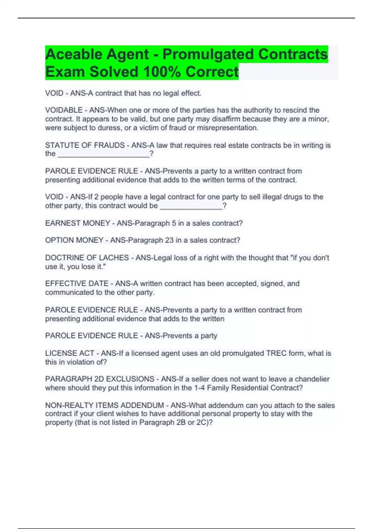 Aceable Agent - Promulgated Contracts Exam Solved 100% Correct