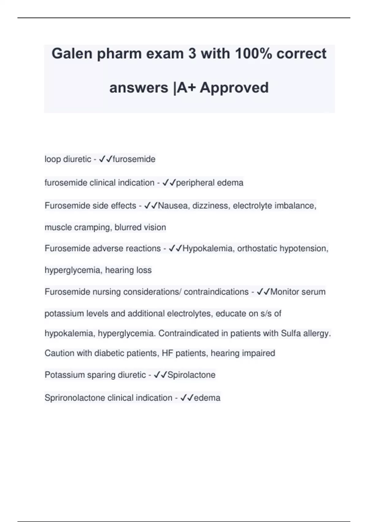 Galen pharm exam 3 with 100% correct answers |A+ Approved loop diuretic - furosemide furosemide clinical indication - peripheral edema Furosemide side effects - Nausea, dizziness, electrolyte imbalance, muscle cramping, blurred vision Furosemide adverse reactions - Hypokalemia, orthostatic hypotension, hyperglycemia, hearing loss Furosemide nursing considerations/ contraindications - Monitor serum potassium levels and additional electrolytes, educate on s/s of hypokalemia, hyperglycemia. Contraindicated in patients with Sulfa allergy. Caution with diabetic patients, HF patients, hearing impaired Potassium sparing diuretic - Spirolactone Sprironolactone clinical indication - edema
