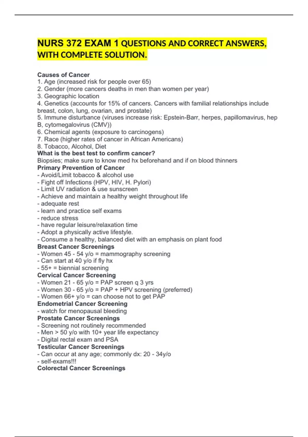 NURS 372 EXAM 1 QUESTIONS AND CORRECT ANSWERS, WITH COMPLETE SOLUTION. Causes of Cancer 1. Age (increased risk for people over 65) 2. Gender (more cancers deaths in men than women per year) 3. Geographic location 4. Genetics (accounts for 15% of cancers. Cancers with familial relationships include breast, colon, lung, ovarian, and prostate) 5. Immune disturbance (viruses increase risk: Epstein-Barr, herpes, papillomavirus, hep B, cytomegalovirus (CMV)) 6. Chemical agents (exposure to carcinogens) 7. Race (higher rates of cancer in African Americans) 8. Tobacco, Alcohol, Diet What is the best test to confirm cancer? Biopsies; make sure to know med hx beforehand and if on blood thinners Primary Prevention of Cancer - Avoid/Limit tobacco & alcohol use - Fight off Infections (HPV, HIV, H. Pylori) - Limit UV radiation & use sunscreen - Achieve and maintain a healthy weight throughout life - adequate rest - learn and practice self exams - reduce stress - have regular leisure/relaxation time - Adopt a physically active lifestyle. - Consume a healthy, balanced diet with an emphasis on plant food Breast Cancer Screenings - Women 45 - 54 y/o = mammography screening - Can start at 40 y/o if fly hx - 55+ = biennial screening Cervical Cancer Screening - Women 21 - 65 y/o = PAP screen q 3 yrs - Women 30 - 65 y/o = PAP + HPV screening (preferred) - Women 66+ y/o = can choose not to get PAP Endometrial Cancer Screening - watch for menopausal bleeding Prostate Cancer Screenings - Screening not routinely recommended - Men > 50 y/o with 10+ year life expectancy - Digital rectal exam and PSA Testicular Cancer Screenings - Can occur at any age; commonly dx: 20 - 34y/o - self-exams!!! Colorectal Cancer Screenings - Screening begins @ 50 y/o for average risk - Non-invasive exams (Fecal Occult Blood test (FOBT), fecal immunochemical test (FIT), Stool DNA) - Home testing recommended - Various endoscopic exams (Flex sig q 5 years), colonoscopy q 10 years) Lung Cancer Screenings - Smokers w/ 30 pack-year HX (quit 15 yrs to be a non smoker) - LDCT (low dose helical CT scan)- expensive and not done often CAUTION C - hange in bowel or bladder habits A - sore that does not heal U - nusual bleeding or discharge from any body orifice T - hickening or a lump in the breast or elsewhere I - ndigestion or difficulty in swallowing O- bvious change in a wart or mole N - agging cough or hoarseness Clinical Staging Classification System of Cancer Stage 0: Cancer in situ Stage I: Tumor limited to the tissue of origin; localized tumor growth Stage II: Limited local spread Stage III: Extensive local and regional spread Stage IV: Metastasis Benign Tumors vs Malignant Tumors Benign: well differentiated; usually encapsulated; metastasis is absent; rarely recur Malignant: range from well differentiated to undifferentiated; able to metastasize; frequent recurrence; rarely encapsulated; moderate to marked vascularity How many years until considered cancer free? 5 yrs Goal of Cancer Treatments - Cure (surgery) - Control (debulking/cytoreductive procedure, chemo, radiation) - Comfort (Palliative) Neoadjuvant therapy administration of therapeutic agents before a main treatment (hormone therapy prior to radical radiotherapy for adenocarcinoma of the prostate) Adjuvant therapy therapy that is given in addition to the primary, main, or initial therapy to maximize its effectiveness; modifies the effect of another agent (marijuana TX in conjunction with opioids for pain management) Cancer Treatment: Chemo - Action: Use of chemicals given as a systemic therapy for cancer; mainstay for most solid tumors and hematologic cancers; can offer cure, control, or palliative care; cannot distinguish between normal and cancer cells - Implications: may pose an occupational hazard (drugs may be absorbed through skin, inhalation, during preparation, transportation, and administration); only properly trained personnel should handle drugs; monitor and report infection or bleeding - Methods of Admin: Oral, IM, IV (most common), Intracavitary, Intrathecal, Intraarterial Central vascular access device (VAD) administration placement in large blood vessels; frequent, continuous, or intermittent administration; can be used to administer other fluids (blood, electrolytes, etc.) Regional Administration of Chemo delivery of drug directly into tumor site; higher concentrations of drug can be delivered with less systemic toxicity; delivery methods are intraarterial, intraperitoneal, intrathecal, and intravesical Intraarterial Chemotherapy delivers drug through arteries supplying tumor; method has been used for the treatment of osteogenic sarcoma, cancers of the head and neck, bladder, brain, and cervix, melanoma, primary liver cancer, and metastatic liver disease Intraperitoneal Chemotherapy delivers drug to peritoneal cavity for treatment of peritoneal metastases; chemotherapy is generally infused into the peritoneum in 1 to 2 L of fluid and allowed to "dwell" in the peritoneum for a period of 1 to 4 hours; following the "dwell time," the fluid is drained from the peritoneum. Intrathecal or Intraventricular Chemotherapy Involves lumbar puncture and injection of chemotherapy into subarachnoid space Intravesical Bladder Chemotherapy Agent added to bladder by urinary catheter and retained for 1 to 3 hours Management of Cancer Pain - Drug options for pain management (Morphine, Dilaudid); think about addiction - Analgesics taken on a scheduled basis - with additional doses for breakthrough pain - Relaxation therapy and imagery Management of Cancer Treatment Related Nausea - prophylactic administration of antiemetics (Zofran) - avoid offending odors - assess for signs & symptoms of alkalosis, dehydration, and I & O - tell caregiver to avoid eating in front of pt who is on chemo - monitor carefully to avoid weight loss - weigh twice weekly - recommend small, frequent meals & nutritional supplements (cold foods, bland foods, avoid spicy) Management of Cancer Treatment Related Di