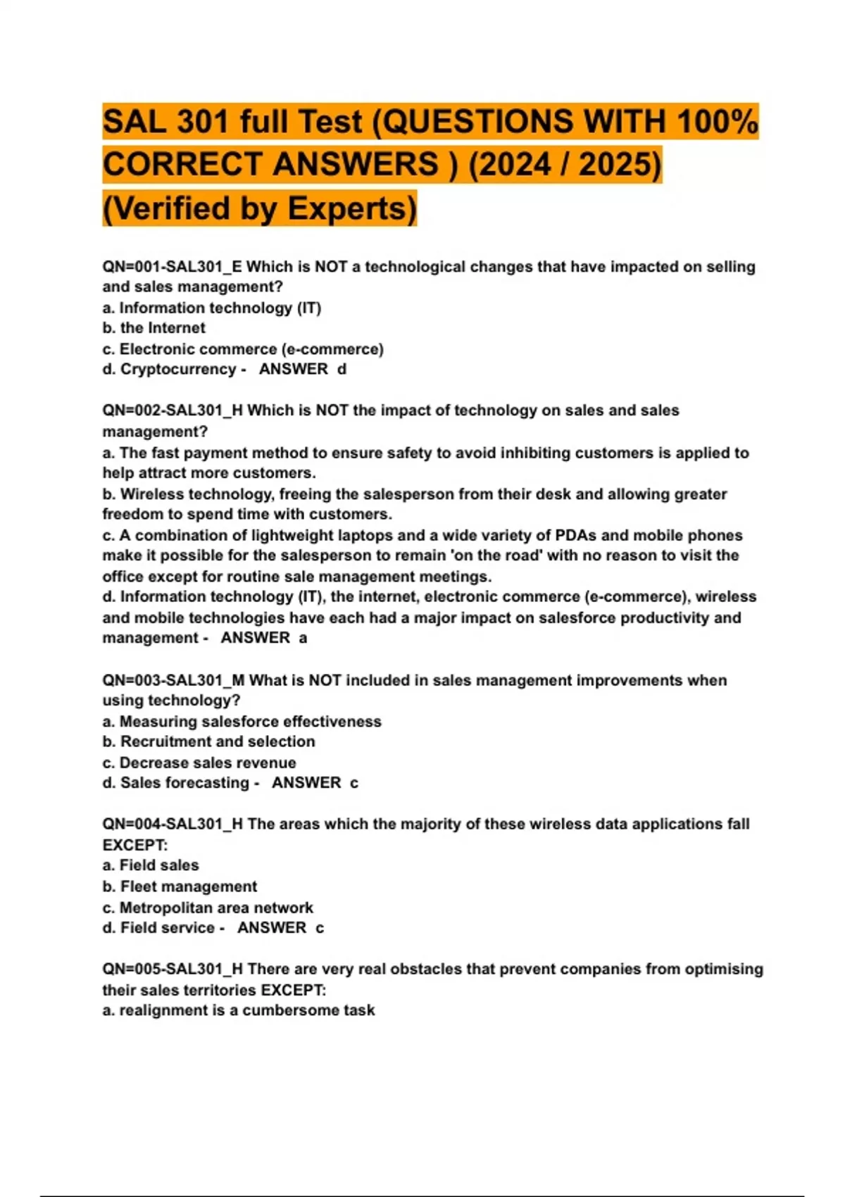 QN=001-SAL301_E Which is NOT a technological changes that have impacted on selling and sales management? a. Information technology (IT) b. the Internet c. Electronic commerce (e-commerce) d. Cryptocurrency - ANSWER d QN=002-SAL301_H Which is NOT the impact of technology on sales and sales management? a. The fast payment method to ensure safety to avoid inhibiting customers is applied to help attract more customers. b. Wireless technology, freeing the salesperson from their desk and allowing greater freedom to spend time with customers. c. A combination of lightweight laptops and a wide variety of PDAs and mobile phones make it possible for the salesperson to remain 'on the road' with no reason to visit the office except for routine sale management meetings. d. Information technology (IT), the internet, electronic commerce (e-commerce), wireless and mobile technologies have each had a major impact on salesforce productivity and management - ANSWER a QN=003-SAL301_M What is NOT included in sales management improvements when using technology? a. Measuring salesforce effectiveness b. Recruitment and selection c. Decrease sales revenue d. Sales forecasting - ANSWER c