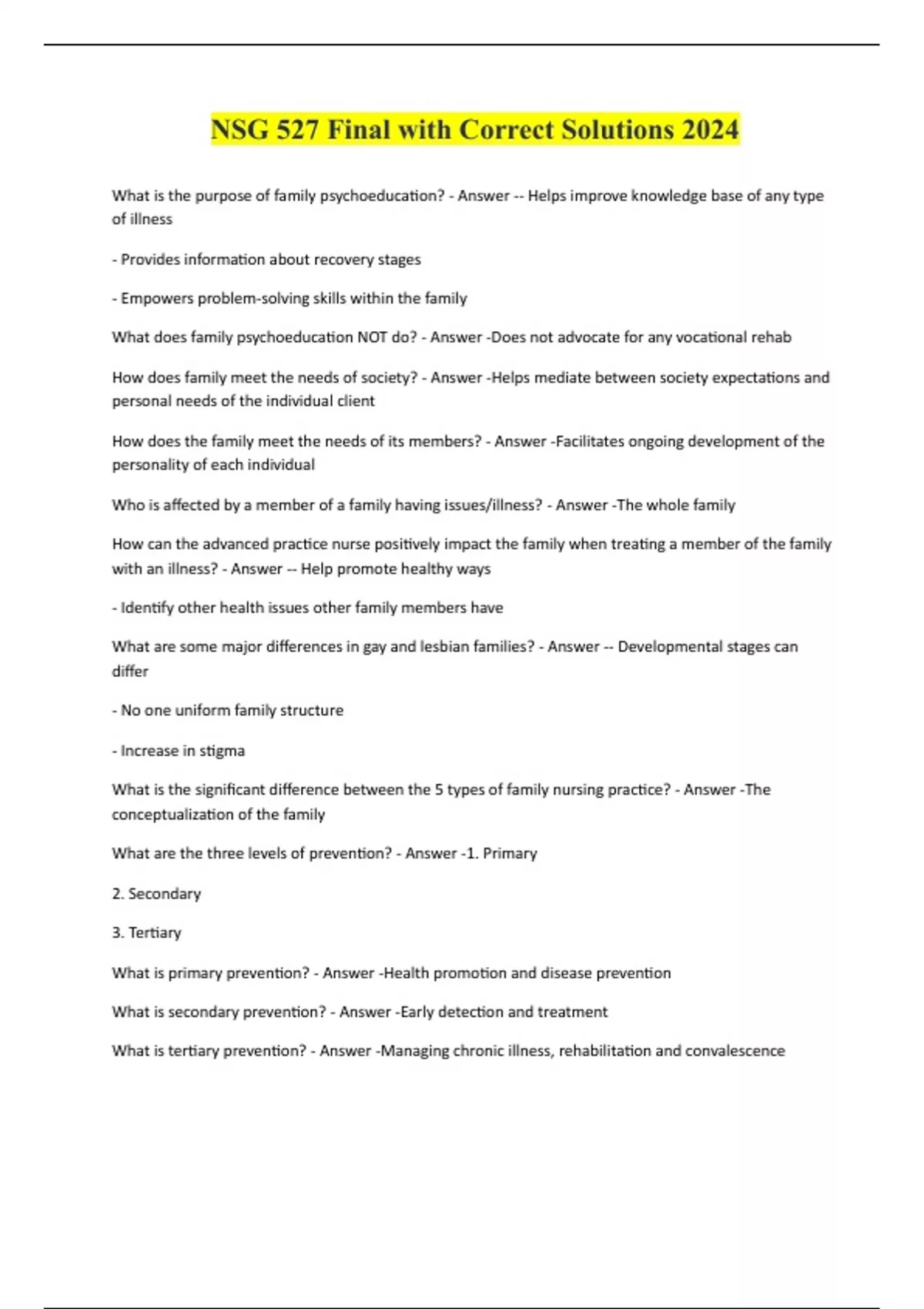 NSG 527 Final with Correct Solutions 2024 What is the purpose of family psychoeducation? - Answer -- Helps improve knowledge base of any type of illness - Provides information about recovery stages - Empowers problem-solving skills within the family What does family psychoeducation NOT do? - Answer -Does not advocate for any vocational rehab How does family meet the needs of society? - Answer -Helps mediate between society expectations and personal needs of the individual client How does the family meet the needs of its members? - Answer -Facilitates ongoing development of the personality of each individual Who is affected by a member of a family having issues/illness? - Answer -The whole family How can the advanced practice nurse positively impact the family when treating a member of the family with an illness? - Answer -- Help promote healthy ways - Identify other health issues other family members have What are some major differences in gay and lesbian families? - Answer -- Developmental stages can differ - No one uniform family structure - Increase in stigma What is the significant difference between the 5 types of family nursing practice? - Answer -The conceptualization of the family What are the three levels of prevention? - Answer -1. Primary 2. Secondary 3. Tertiary What is primary prevention? - Answer -Health promotion and disease prevention What is secondary prevention? - Answer -Early detection and treatment What is tertiary prevention? - Answer -Managing chronic illness, rehabilitation and convalescence