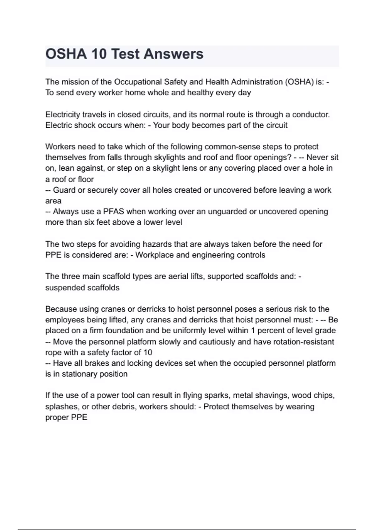 OSHA 10 Test Answers